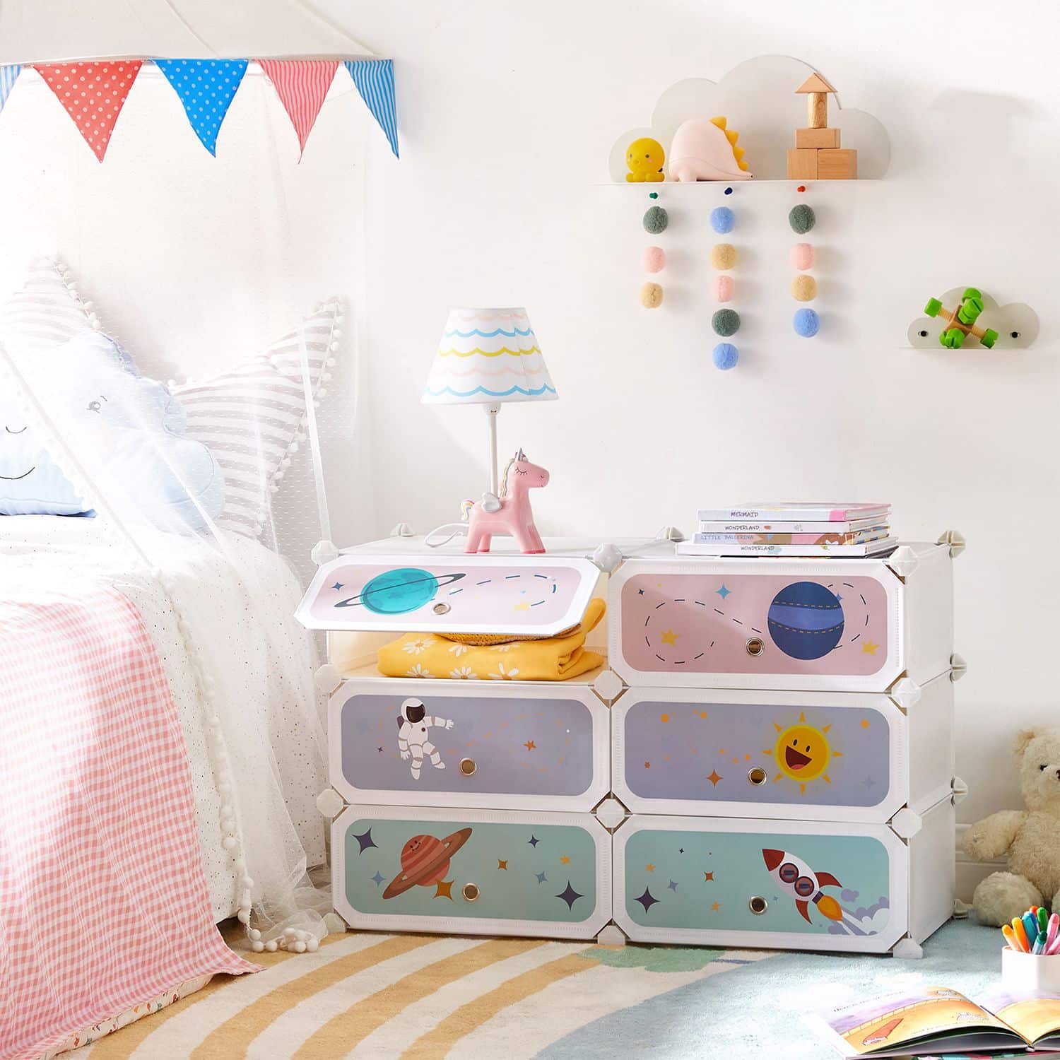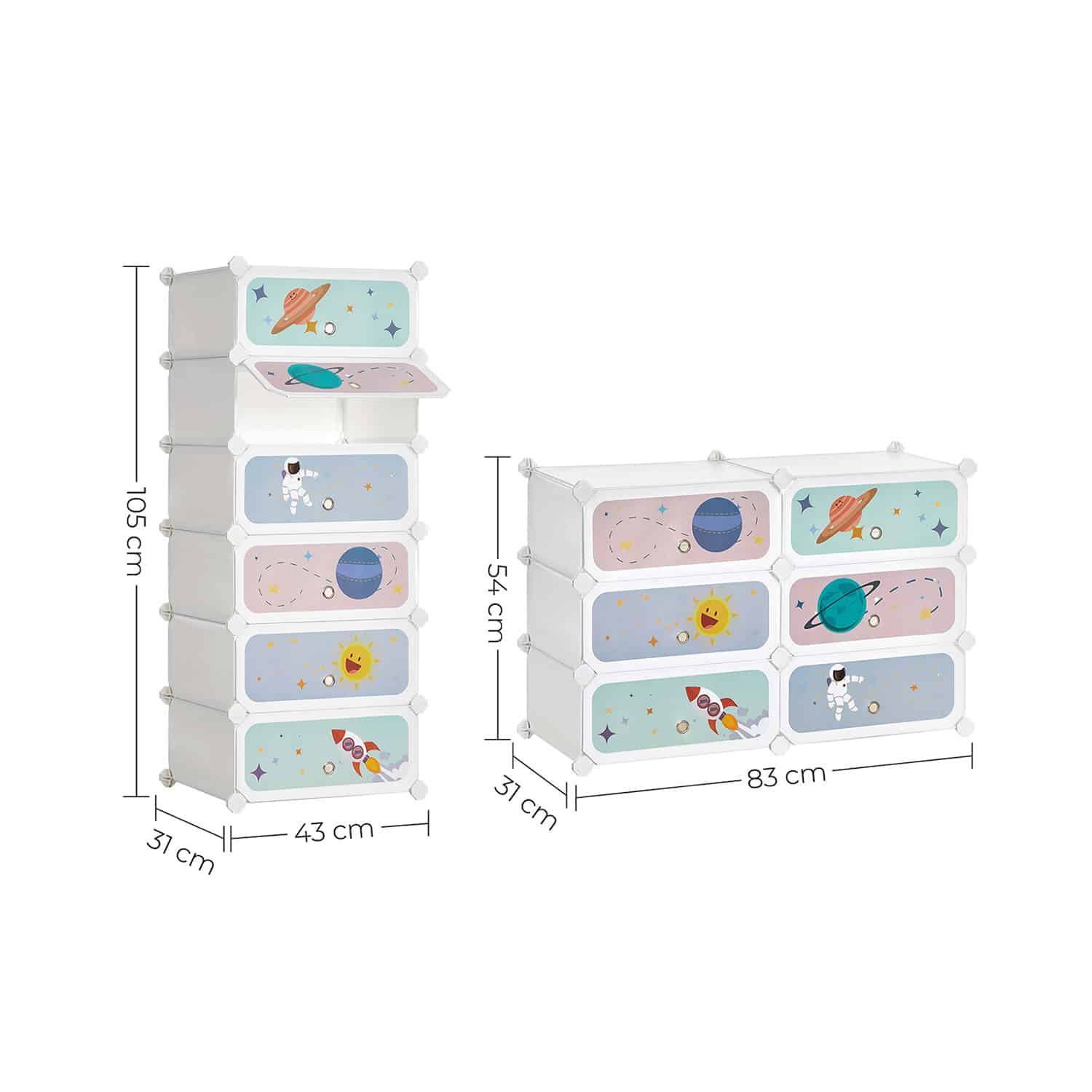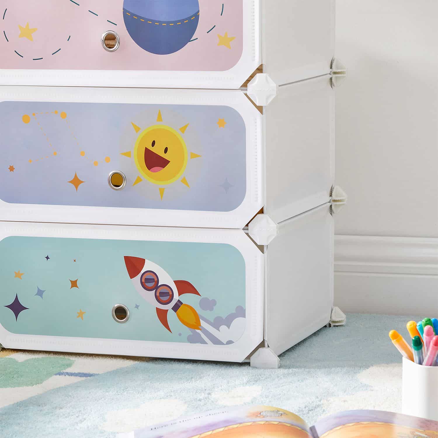 Įmantrūs raštai, gaivios spalvos ir mylintys kubeliai – jei jūsų vaikai domisi erdve arba mėgsta mokytis žaisdami, ši vaikiška lentyna tikrai sukels entuziazmo audrą ir paskatins vaikus patiems susitvarkyti savo daiktus. Kambarys sužibės nauju spindesiu!