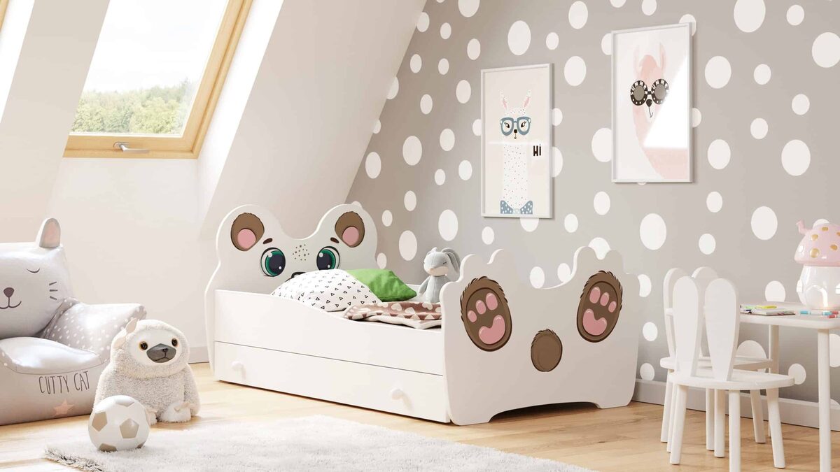 Vaikiška lova Animals su stalčiumi ir čiužiniu 164 cm x 90 cm x 70 cm, meškiukas, yra puikus pasirinkimas jūsų vaikui. Ši lova ne tik patogi, bet ir funkcionali, su integruotu stalčiumi, kuris suteikia papildomos vietos daiktams laikyti.