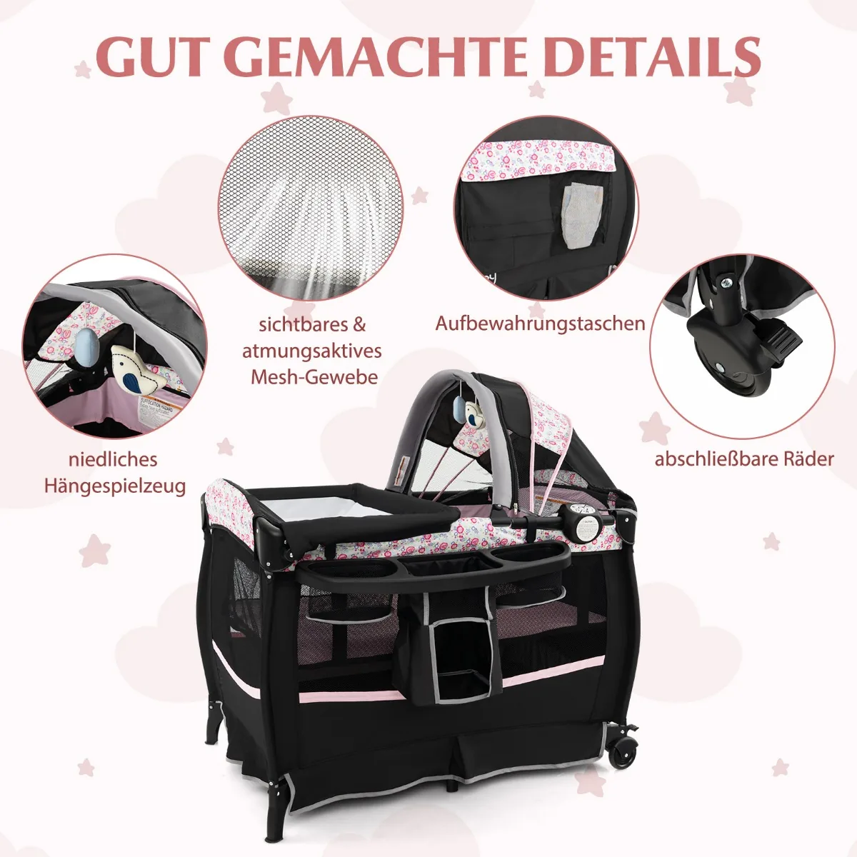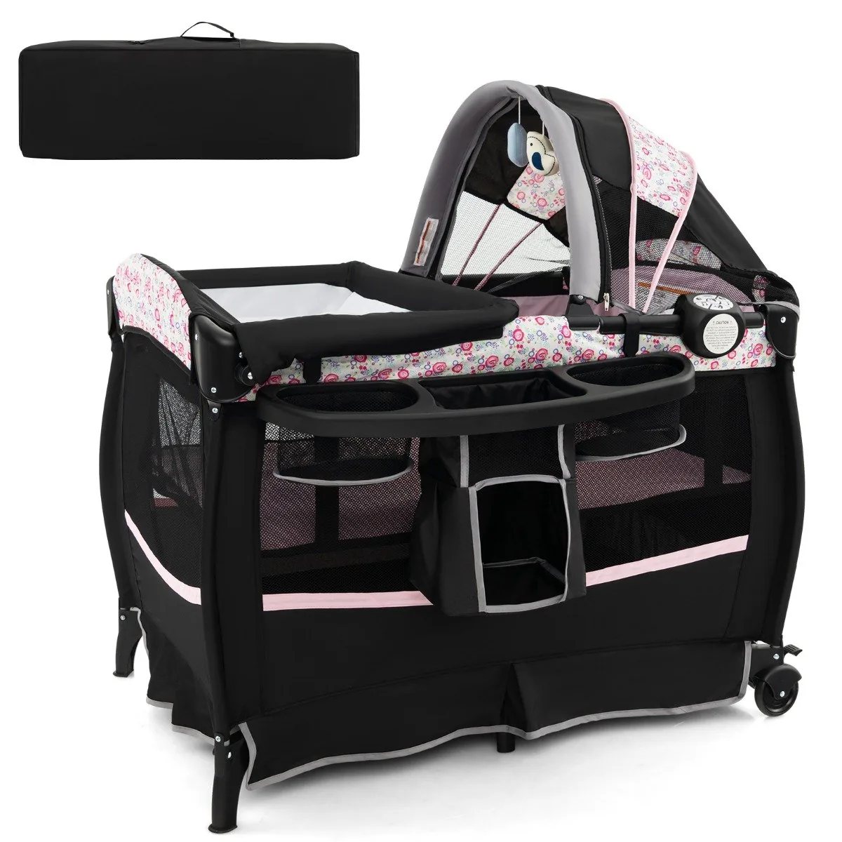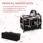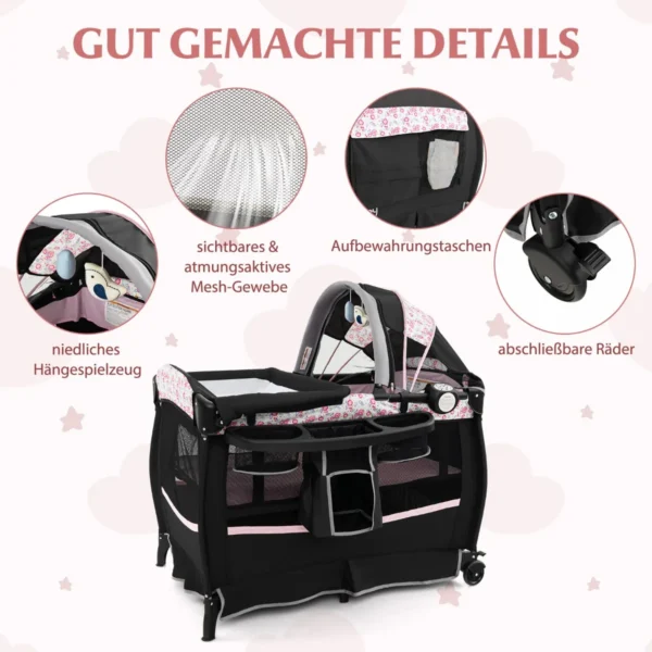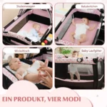 Vaikiška lovytė 102x73x80cm juodos ir rožinės spalvos yra universali ir praktiška kūdikių lovelė, tinkama naudoti nuo gimimo iki 3 metų. Šis 4 viename žaidimų centras apima lopšelį, persirengimo stalą, žaidimų aikštelę ir šoninę lovą, užtikrinančią įvairiapusį panaudojimą kasdienėje priežiūroje.