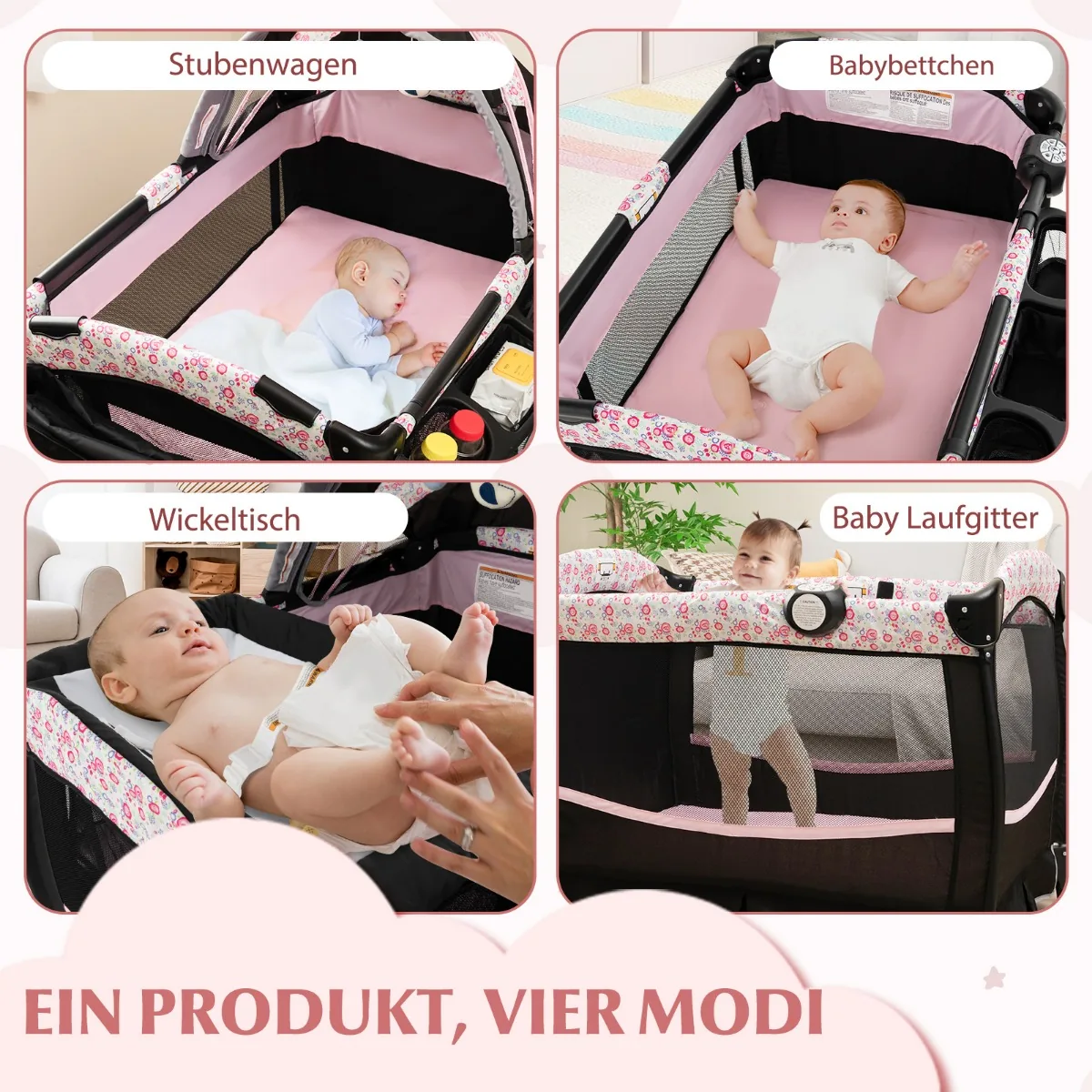• Keturi naudojimo režimai: lopšys, šoninė lova, persirengimo stalas, žaidimų aikštelė.