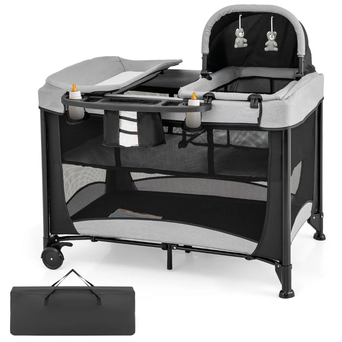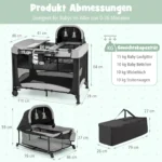 Vaikiška lovytė 110x78x84 cm, juodos/pilkos spalvos, skirta vaikams nuo gimimo iki 36 mėnesių. Daugiafunkcinis kūdikių maniežas su persirengimo stalu, lopšiu ir dideliu krepšiu palengvina kasdienius rūpesčius tėvams ir užtikrina saugią bei patogią vietą kūdikiui miegoti ir žaisti.