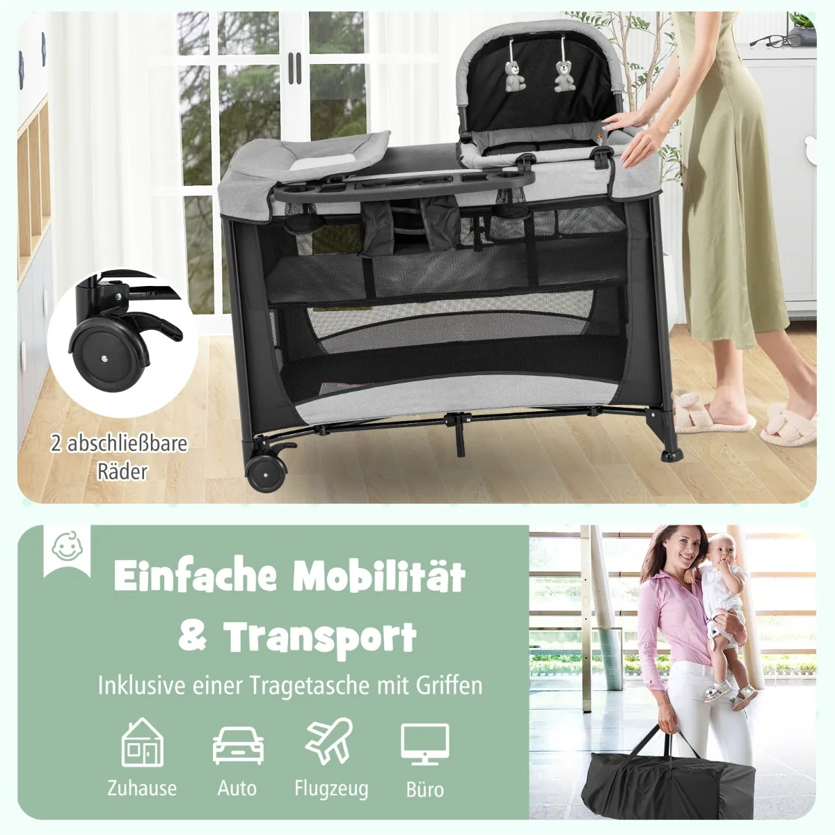 • Universalus 5 viename kūdikių maniežas: lovelė, pilno dydžio lopšys, persirengimo stalas, kūdikių maniežas ir laisvai stovintis maniežas.