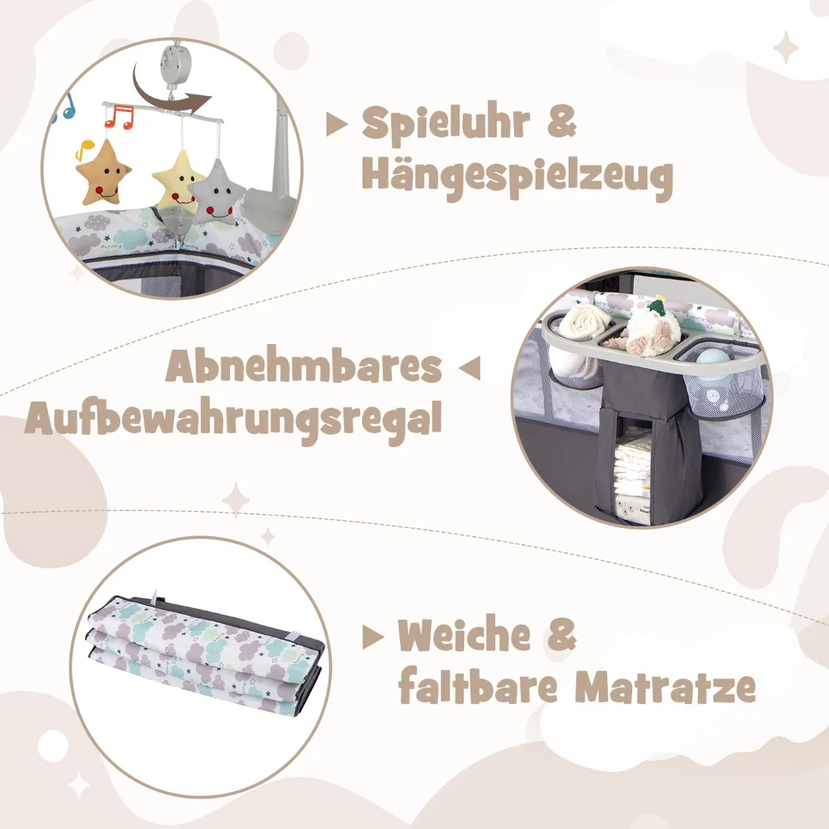 - Galimybė naudoti kaip lovelę, persirengimo stalą, bendrą miegamąją vietą, maniežą ir veiklos centrą.