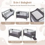 Vaikiška lovytė 125x65x76 cm tamsiai pilkos spalvos yra universali ir funkcionali lova, skirta vaikams nuo gimimo iki 3 metų. Šis daugiafunkcis įrenginys apjungia lovelę, persirengimo stalą, bendrą miegamąją vietą, maniežą ir veiklos centrą, užtikrinant patogumą ir saugumą kasdieniame naudojime.