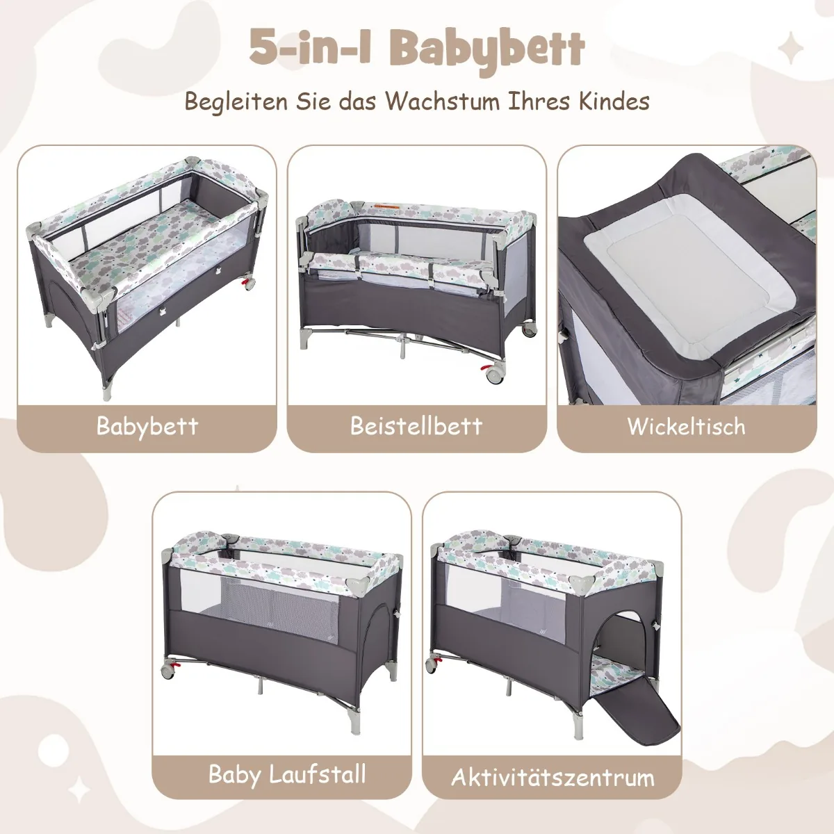 - 5 funkcijos viename: kūdikio lova, šoninė lova, persirengimo stalas, maniežas ir veiklos centras.
