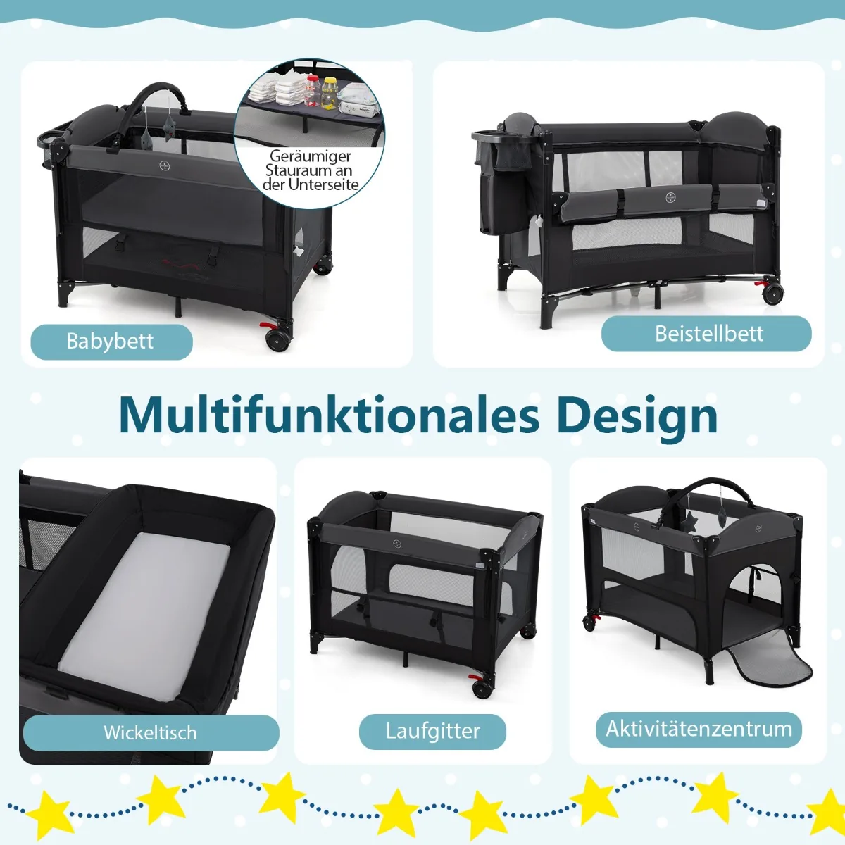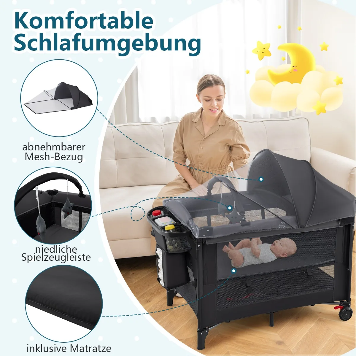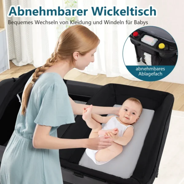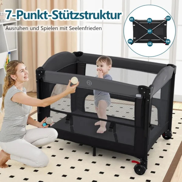 - Daugiafunkcinė kelioninė lovytė naudojama kaip lovytė, bendra miegamoji vieta, persirengimo stalas, maniežas ir žaidimų centras.