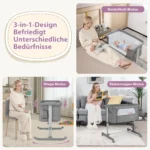 Vaikiška lovytė 86x63x81 cm pilkos spalvos yra skirtas patogiam ir saugiam kūdikio miegui nuo gimimo iki 5 mėnesių. Lovytė turi tris naudojimo režimus ir reguliuojamą aukštį, todėl tinka įvairaus aukščio lovoms. Dėl mobilumo ir praktiškų sprendimų ši lovytė palengvina kūdikio priežiūrą tiek namuose, tiek keliaujant.
