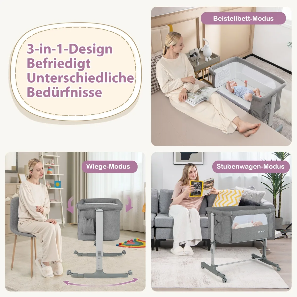 - Laisvai keičiamas tarp miegamojo, lopšio ir lovelės režimų.