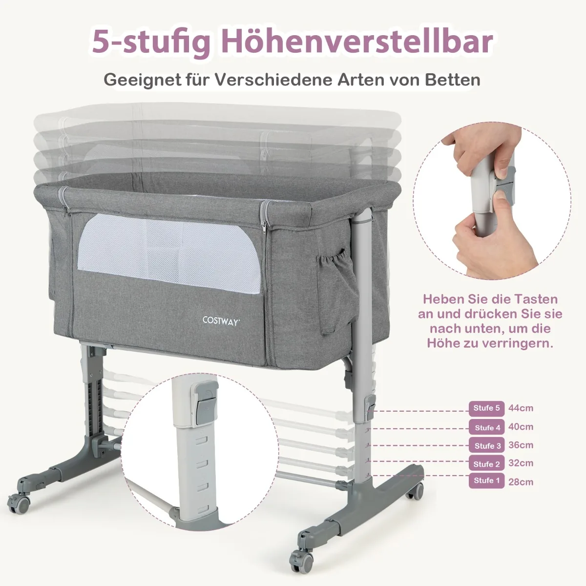 - 5 lygių aukščio reguliavimas leidžia pritaikyti lovytę skirtingų tėvų lovoms.