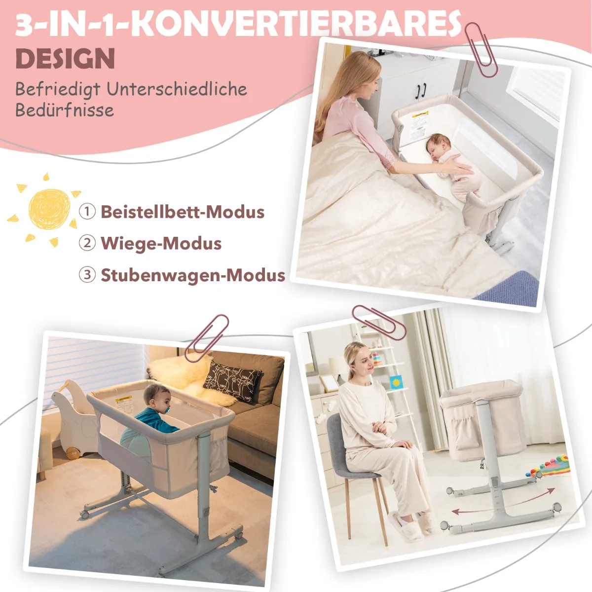 - „Trys viename“ lovytės dizainas: vaikiška lovytė, lopšys ir nešiojamas lopšys viename.