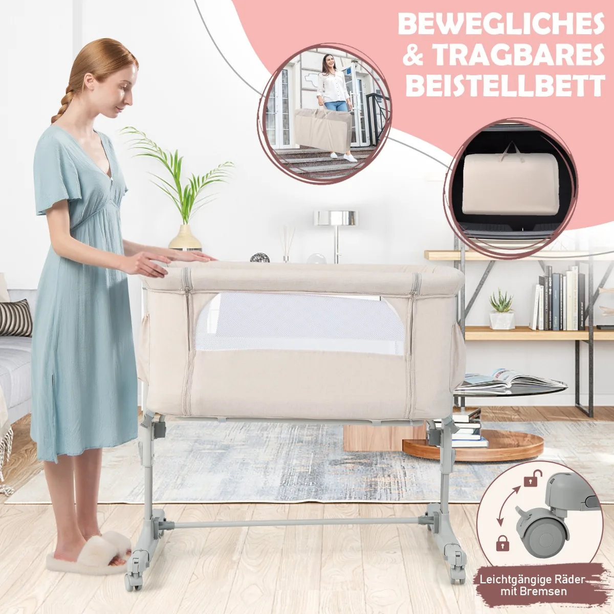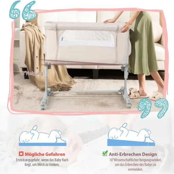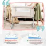 Vaikiška lovytė 86x63x81 cm, smėlio spalvos, skirta saugiam ir patogiam kūdikio miegui. Ši daugiafunkcinė kūdikio lovelė leidžia reguliuoti aukštį ir kampą, pritaikant prie įvairių tėvų lovų. Lovelė turi kvėpuojančius tinklelius, minkštą čiužinį ir ratukus, kurie palengvina jos judėjimą.