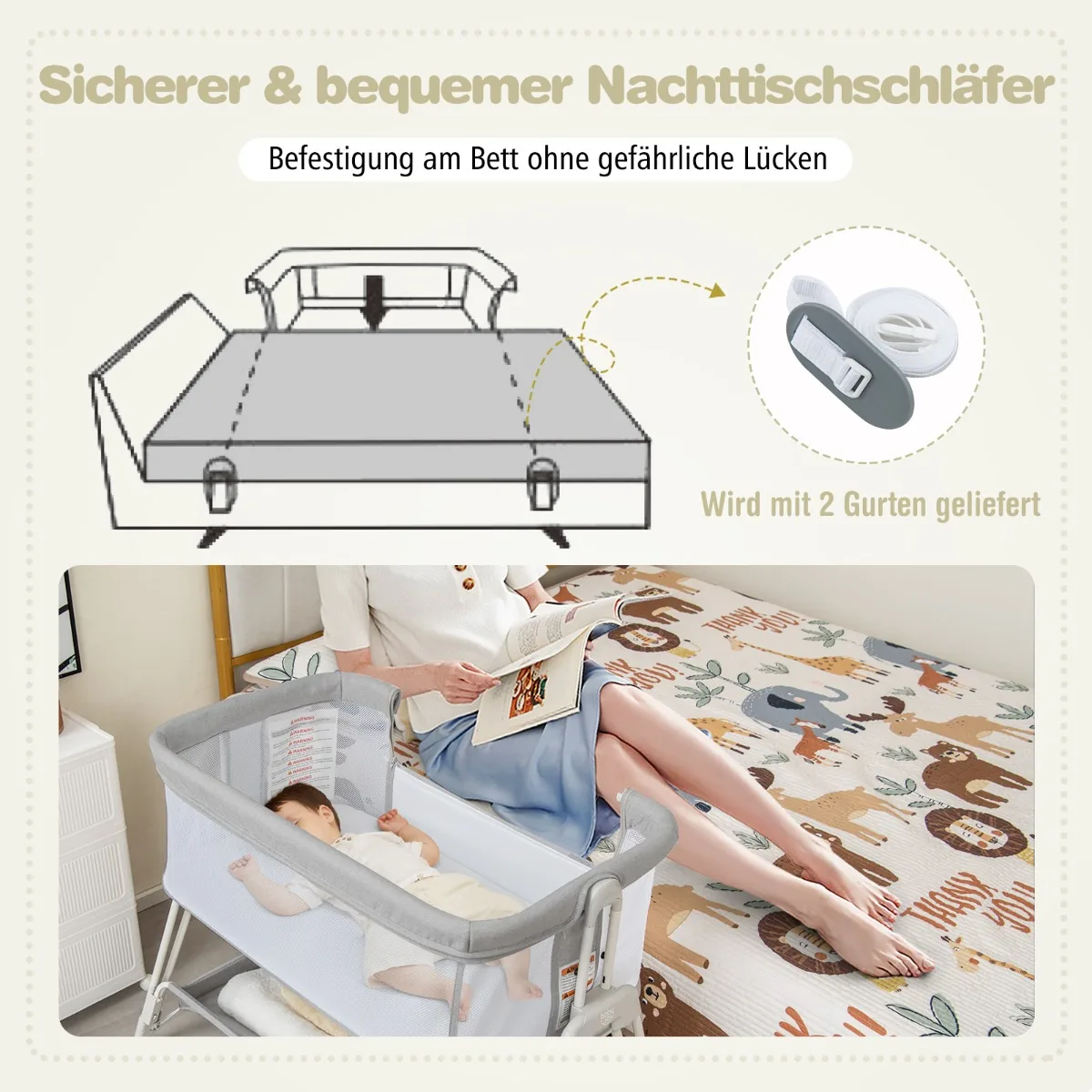 - Dirželiai pritvirtinimui prie tėvų lovos, nepaliekant pavojingų tarpų.