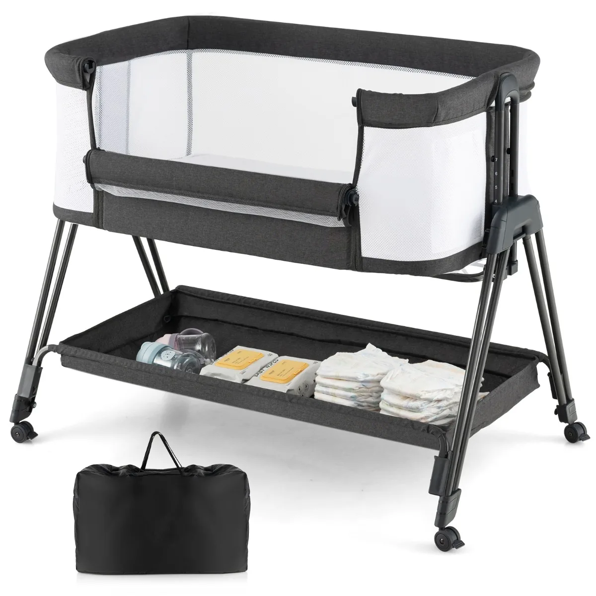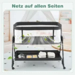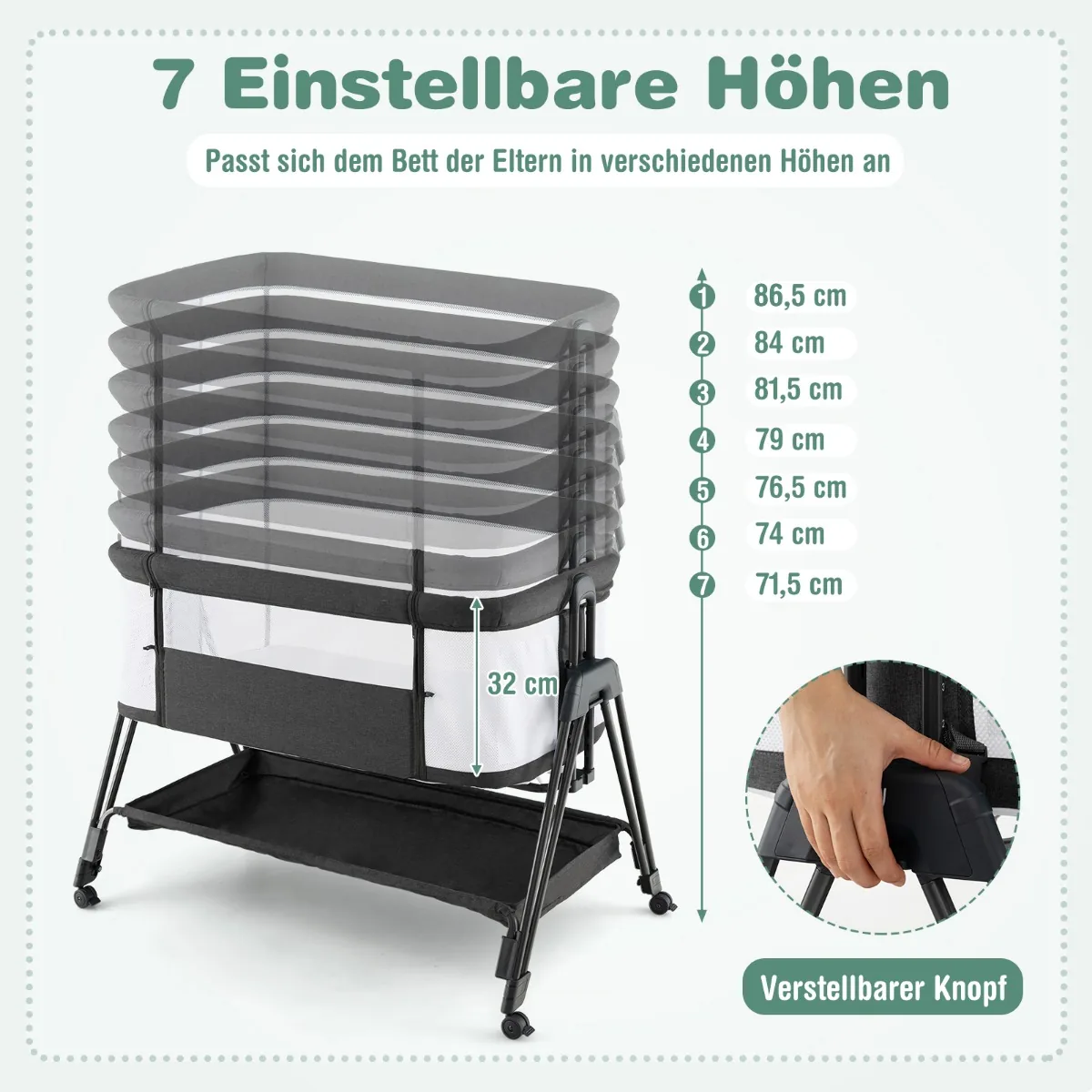 Vaikiška lovytė 97x56x86,5 cm, tamsiai pilkos spalvos, skirta naujagimiams ir mažiems kūdikiams. Lovytė turi reguliuojamą aukštį, tinkamą pritvirtinti prie tėvų lovos, bei užtikrina saugią miego aplinką. Patogus dizainas palengvina kūdikio priežiūrą ir maitinimą bet kuriuo metu.