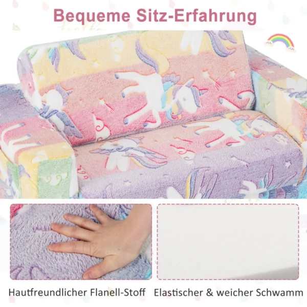 Vaikiška sofa 51x80x42cm, įvairių spalvų, skirta vaikams iki 12 metų, leidžia patogiai sėdėti, žaisti ar ilsėtis. Sulankstoma konstrukcija leidžia ją lengvai paversti gultu, o flanelinis audinys užtikrina minkštumą ir komfortą. Sofa turi šonines kišenes žaislams ar užkandžiams laikyti, o nuimamas skalbiamas užvalkalas palengvina priežiūrą.