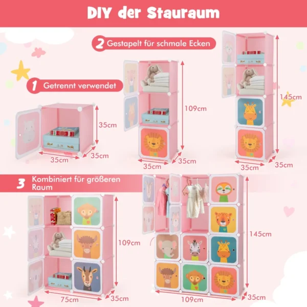 Vaikiška spinta 109x35x145 cm, įvairių spalvų, yra praktiškas sprendimas vaikų kambariui. Ši spinta skirta kūdikių drabužiams, žaislams ir kitiems smulkiems daiktams laikyti, padedanti palaikyti tvarką ir organizuotumą. Lankstus kubelių išdėstymas leidžia pritaikyti ją pagal konkretų poreikį.