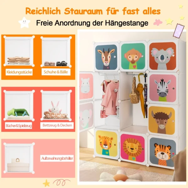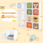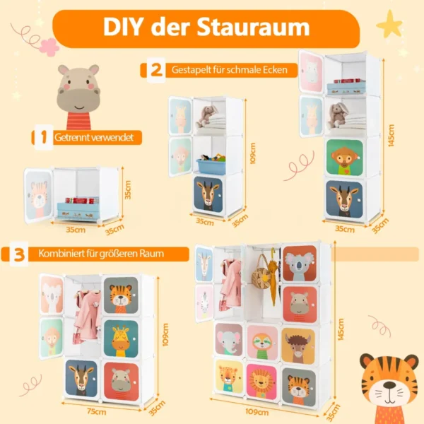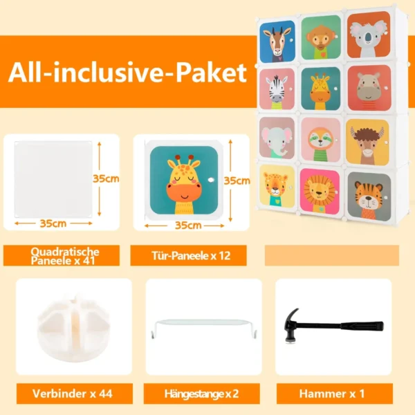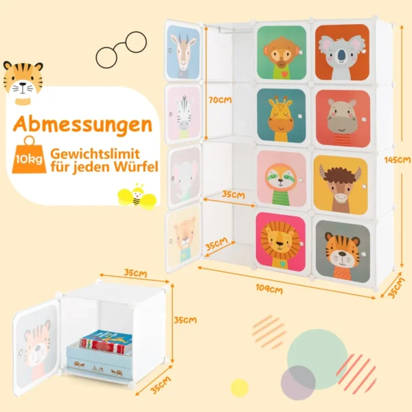 Vaikiška spinta 109x35x145 cm yra praktiškas sprendimas vaikų drabužiams, žaislams ir kitiems daiktams laikyti. Dėl 12 kubelių ir dviejų pakabinamų skyrių ji padeda palaikyti tvarką vaikų kambaryje ir suteikia lankstų organizavimo sprendimą. Spinta pagaminta iš patvarios PP medžiagos ir lengvai surenkama be papildomų įrankių.