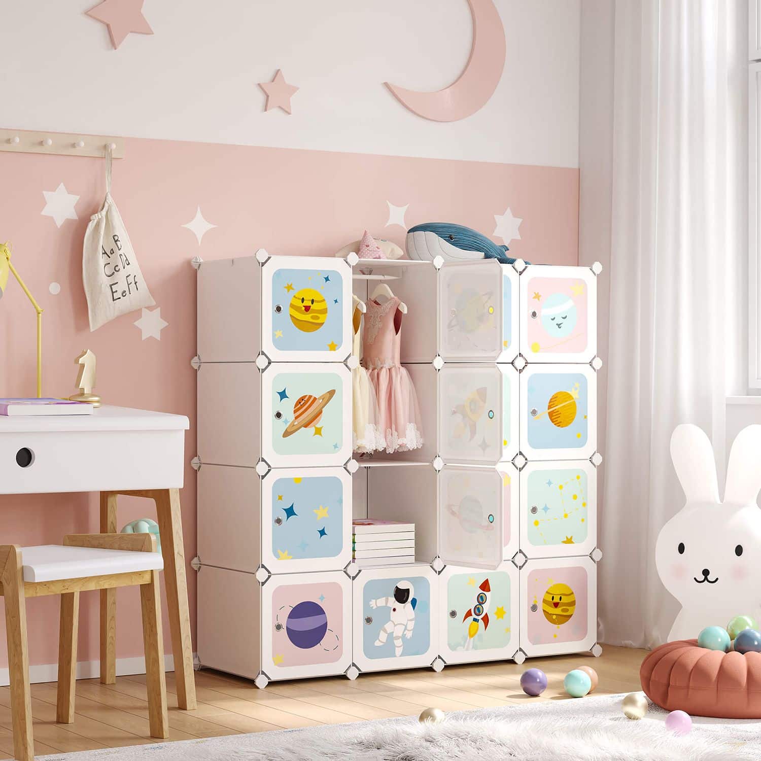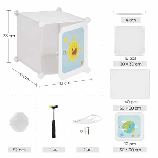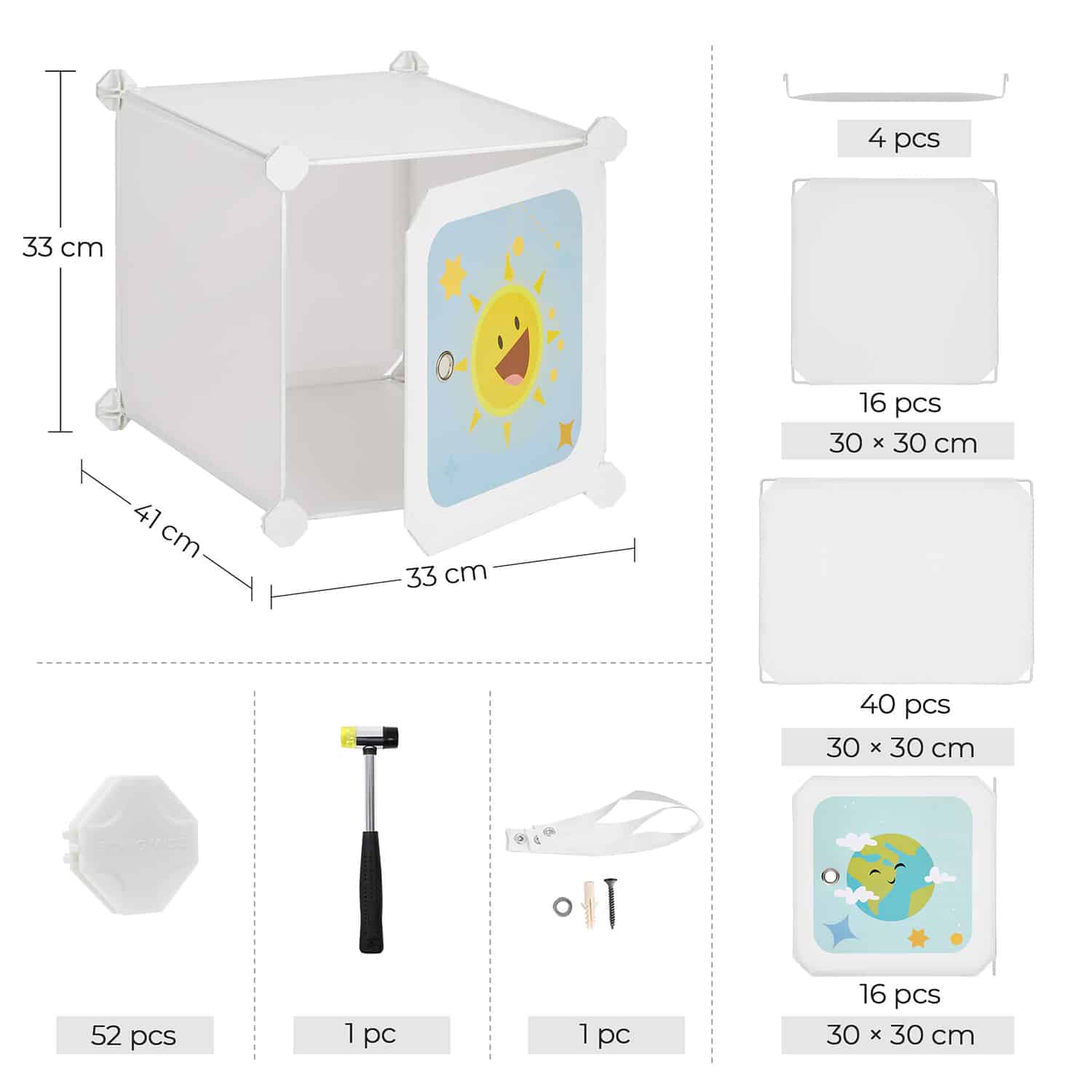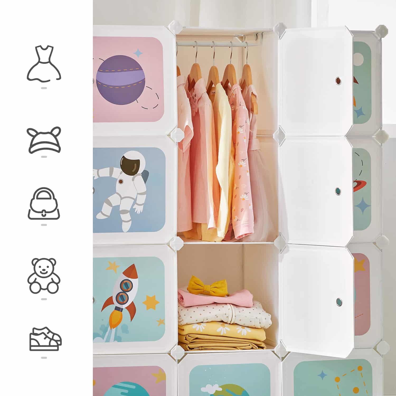 Šioje spintoje yra 4 pakabinami bėgeliai mažoms pakaboms ir atskiri kubeliai žaislams, įrankiams ir batams laikyti. Sujungiamas dizainas leidžia pastatyti baldą taip, kaip norite, kad jis tilptų į bet kurį kampą skirtingose patalpose, pavyzdžiui, miegamajame, žaidimų kambaryje, koridoriuje ar bet kur kitur.