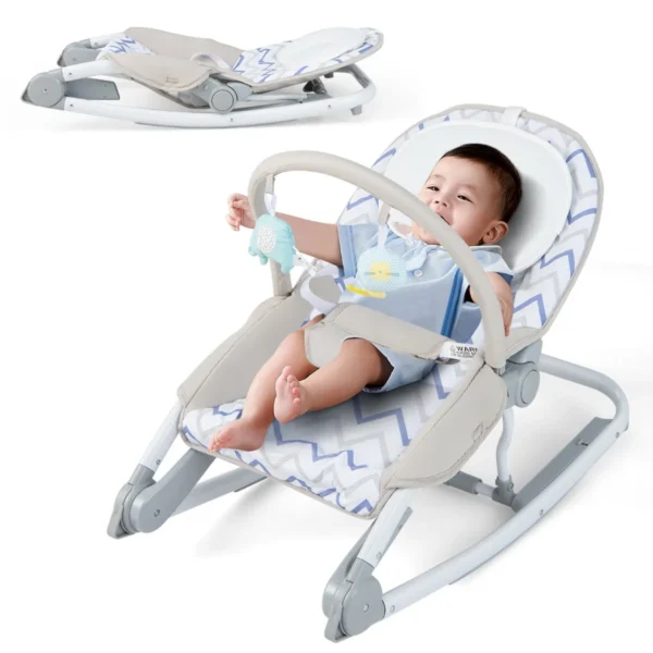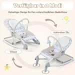 Vaikiška supamoji kėdutė 47x54x50 cm yra praktiškas ir funkcionalus sprendimas kūdikių priežiūrai. Kėdutė turi du režimus – fiksuotą ir siūbavimo, kurie leidžia prisitaikyti prie mažylio nuotaikos ir poreikių. Reguliuojamas atlošas bei nuimama žaislų juosta užtikrina komfortą ir pramogas kūdikiui.