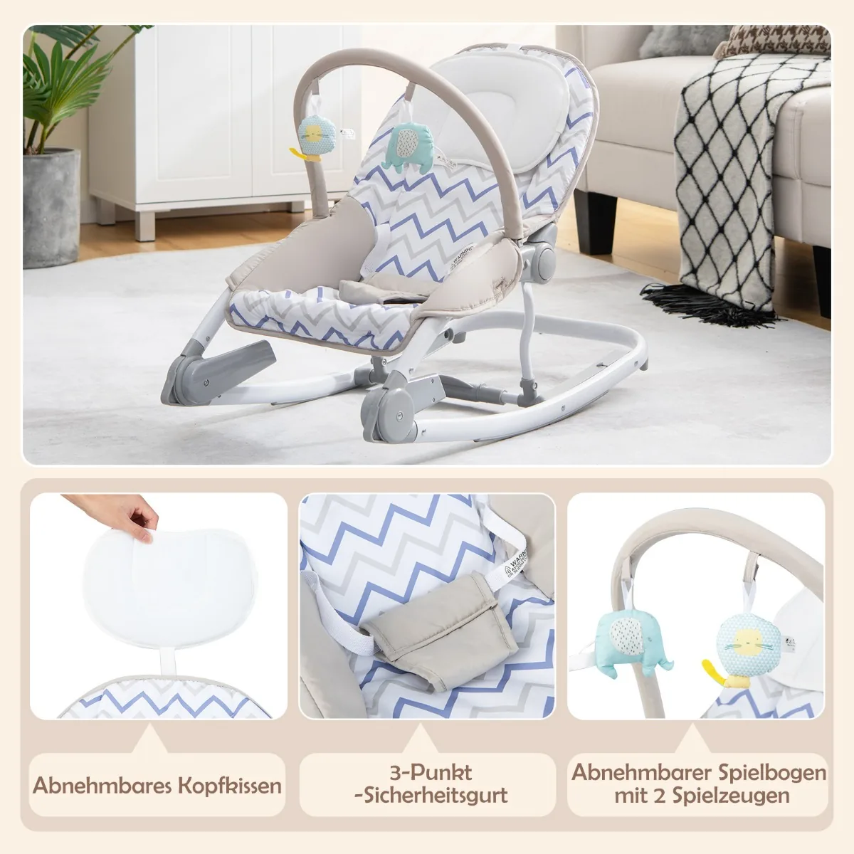 - Nuimama žaislų juosta su 2 minkštais žaislais skatina kūdikio smalsumą ir pramogas.