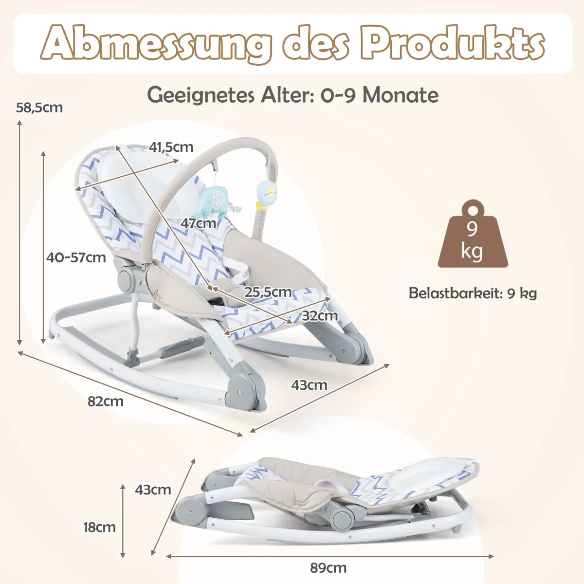 - Reguliuojamas atlošas su 3 padėtimis skirtas patogiai kūdikio padėčiai nustatyti.