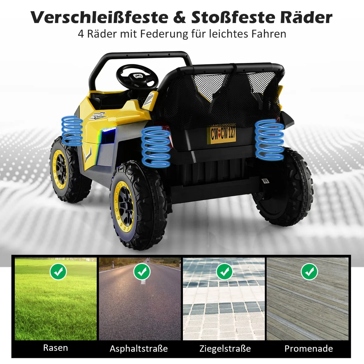 Vaikiškas elektrinis automobilis 118x74x71 cm, geltonos ir juodos spalvos, skirtas vaikams nuo 3 iki 8 metų. Elektromobilis turi 2 vietas, todėl leidžia važiuoti dviem vaikams vienu metu. Šis elektrinis visureigis pasižymi patikumu, saugumu ir funkcionalumu kasdieniam naudojimui lauke.