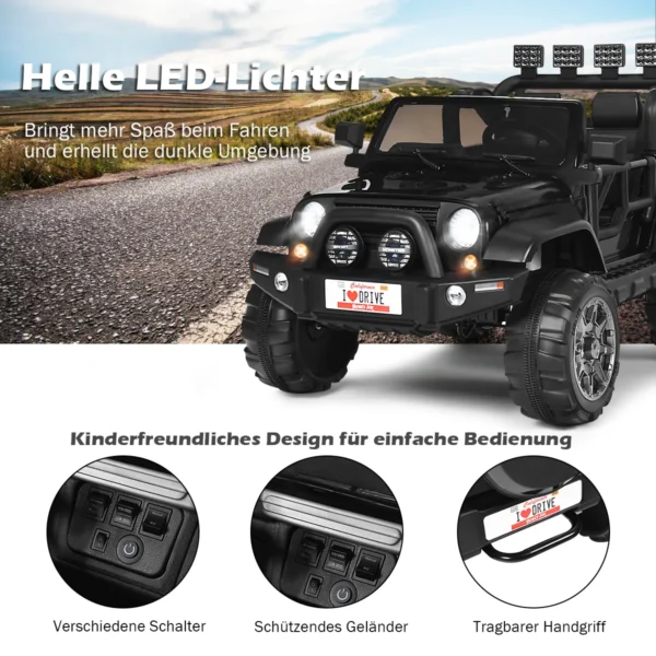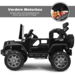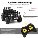 Vaikiškas elektrinis automobilis 123x80x80 cm, juodos spalvos, skirtas vaikams iki 50 kg. Dvivietis elektromobilis su valdymu vairu, pedalais ir 2.4G nuotolinio valdymo pultu tėvams. Tinka įvairioms grindims dėl neslystančių ratų su spyruoklėmis ir patogios konstrukcijos.