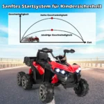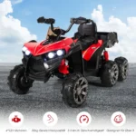 Vaikiškas elektrinis automobilis 129x69x72 cm, juodos ir raudonos spalvos, skirtas vaikams nuo 3 metų. Šis keturratis suteikia saugų ir patogų važiavimą su 4 varomaisiais varikliais, leidžiančiais pasiekti 3-6 km/h greitį. Įrengtos LED lemputės, muzika ir garso mygtukas prideda papildomų pramogų vairuojant.