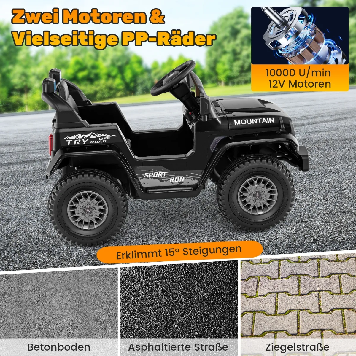 • 2 x 12 V varikliai su 10 000 aps./min. bei galimybė įveikti iki 15° įkalnes.