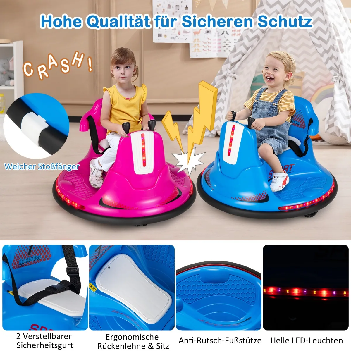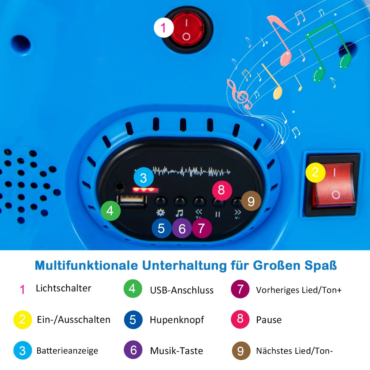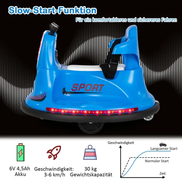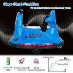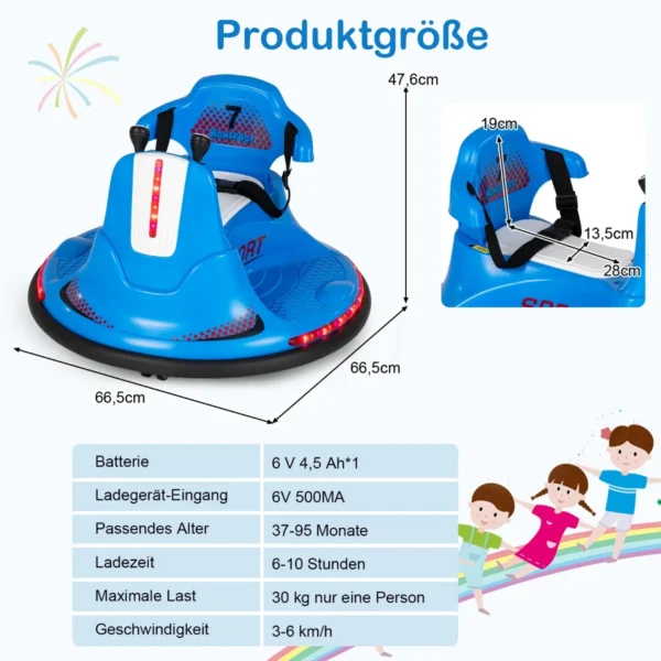 Vaikiškas elektrinis automobilis 66,5×66,5×47,6cm, mėlynos spalvos, skirtas vaikams nuo 37 iki 95 mėnesių. Šis 6 V buferinis automobilis suteikia galimybę vaikams saugiai važinėtis, lenktyniauti ir žaisti su įvairiomis funkcijomis, tokiomis kaip LED apšvietimas, muzika ir garso signalai.