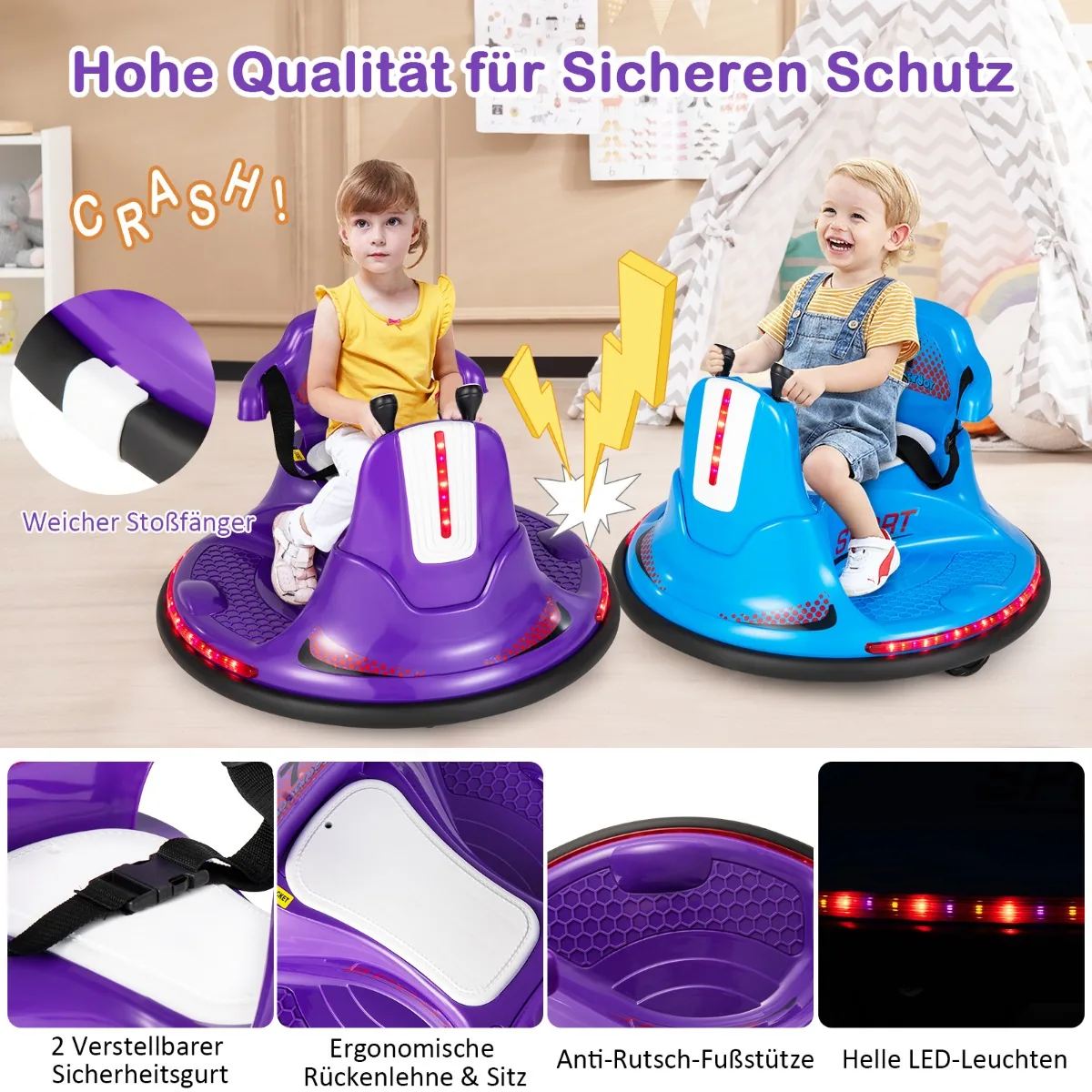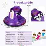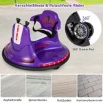 Vaikiškas elektrinis automobilis 66,5×66,5×47,6 cm violetinės spalvos skirtas vaikams nuo 37 iki 95 mėnesių. Šis 6 V buferinis automobilis leidžia vaikams saugiai važiuoti, lenktyniauti ir mėgautis vairavimo malonumais su LED šviesomis, muzika bei nuotolinio valdymo funkcijomis.