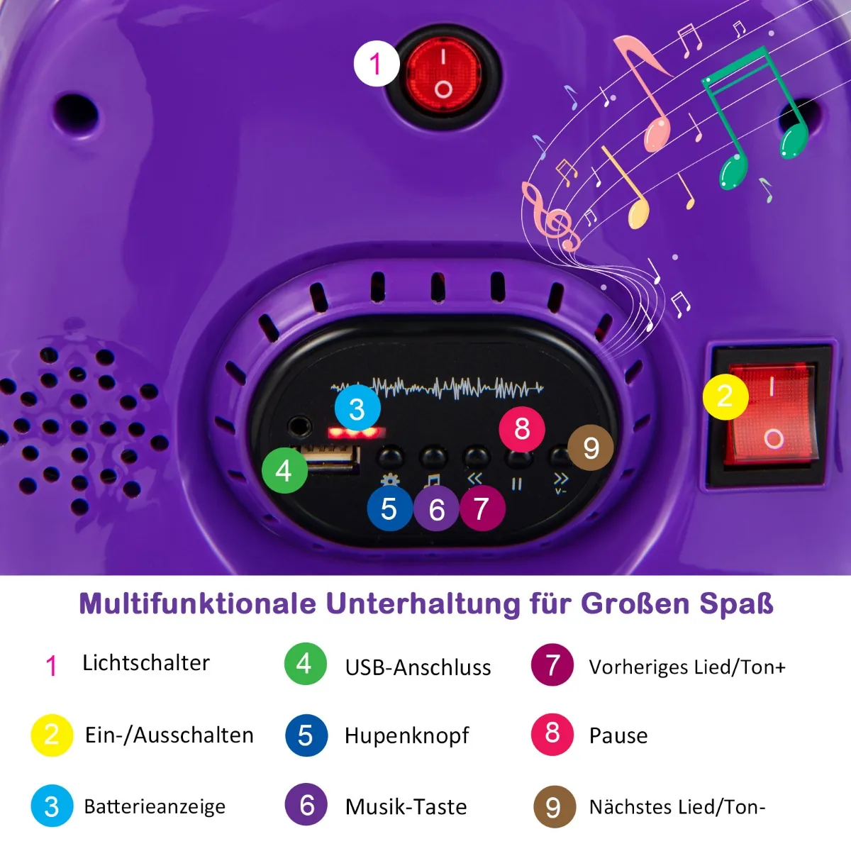 • LED šviestuvai, garso signalai, muzika ir pasakojimų funkcija praturtina vaikų pramogas.