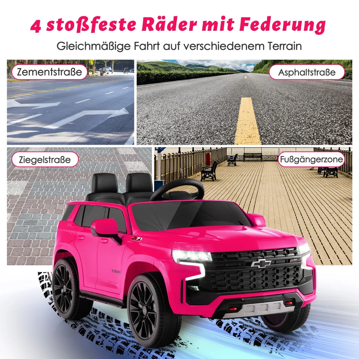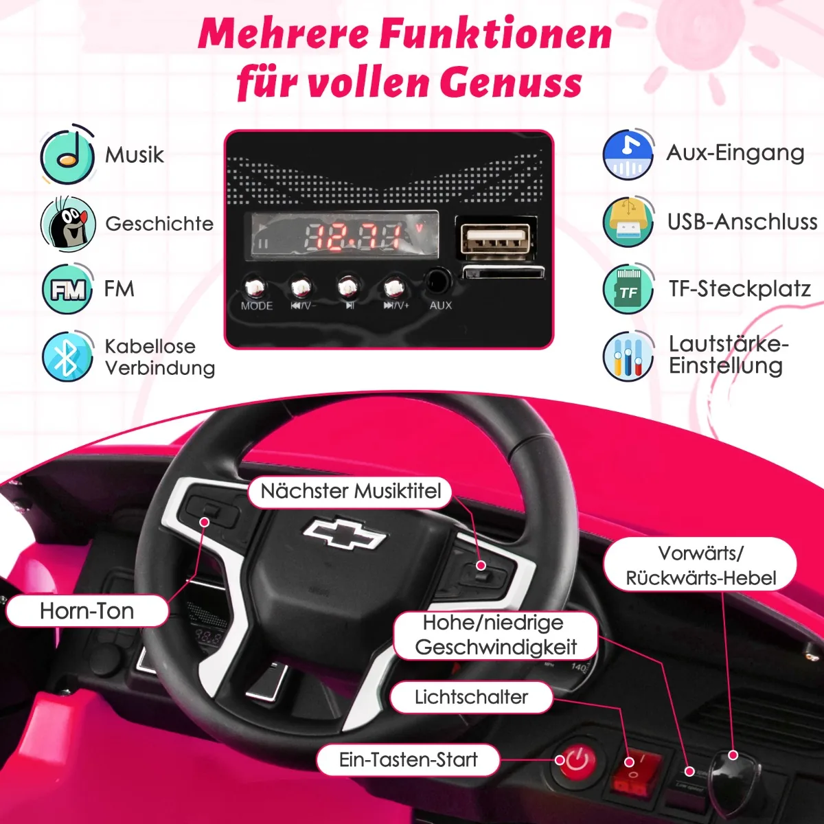Vaikiškas elektrinis automobilis 68x104x53 cm rožinės ir juodos spalvos yra puikus pasirinkimas vaikams nuo 3 iki 6 metų. Elektromobilis imituoja Chevrolet Tahoe visureigį ir suteikia autentišką vairavimo patirtį su įvairiomis funkcijomis bei saugumo elementais.