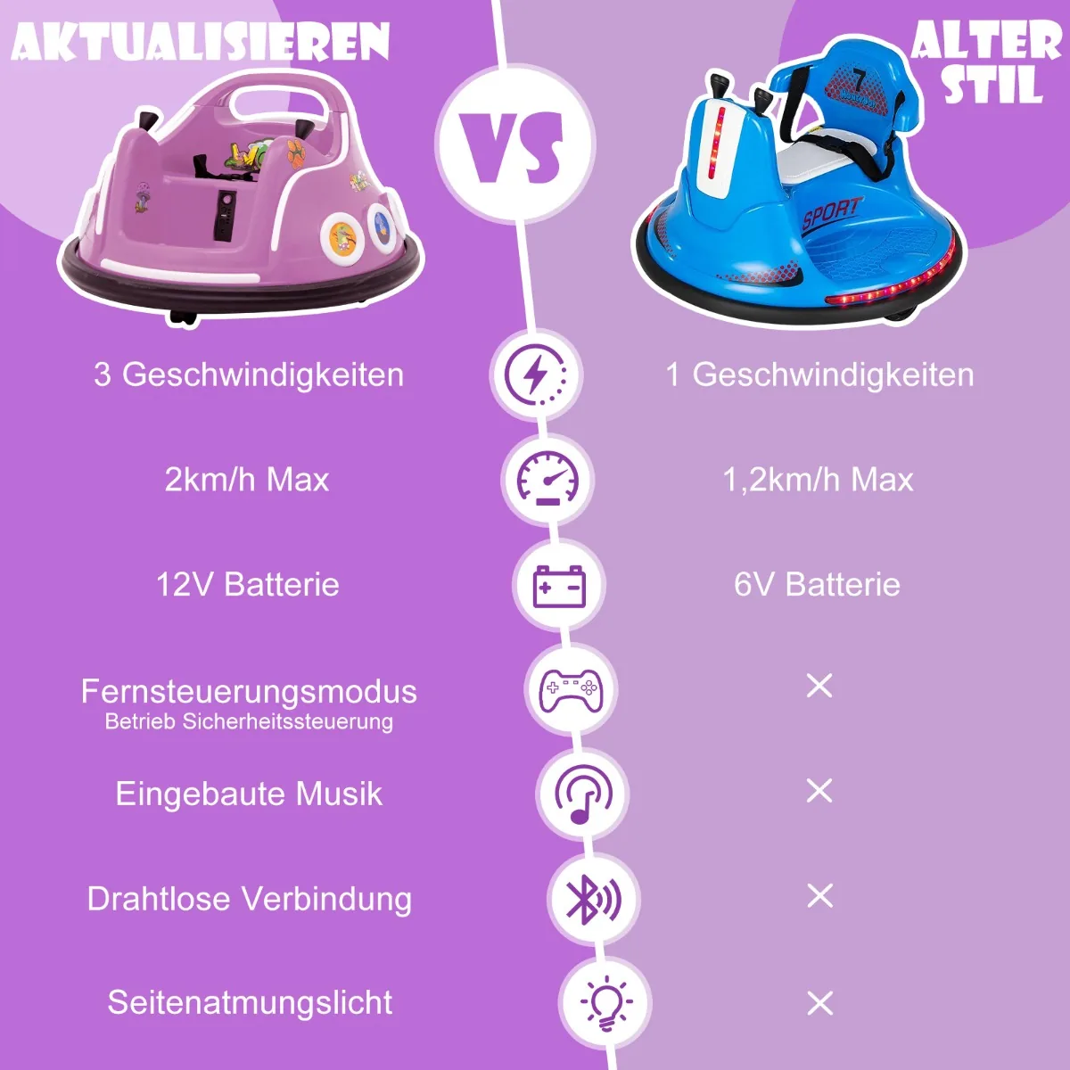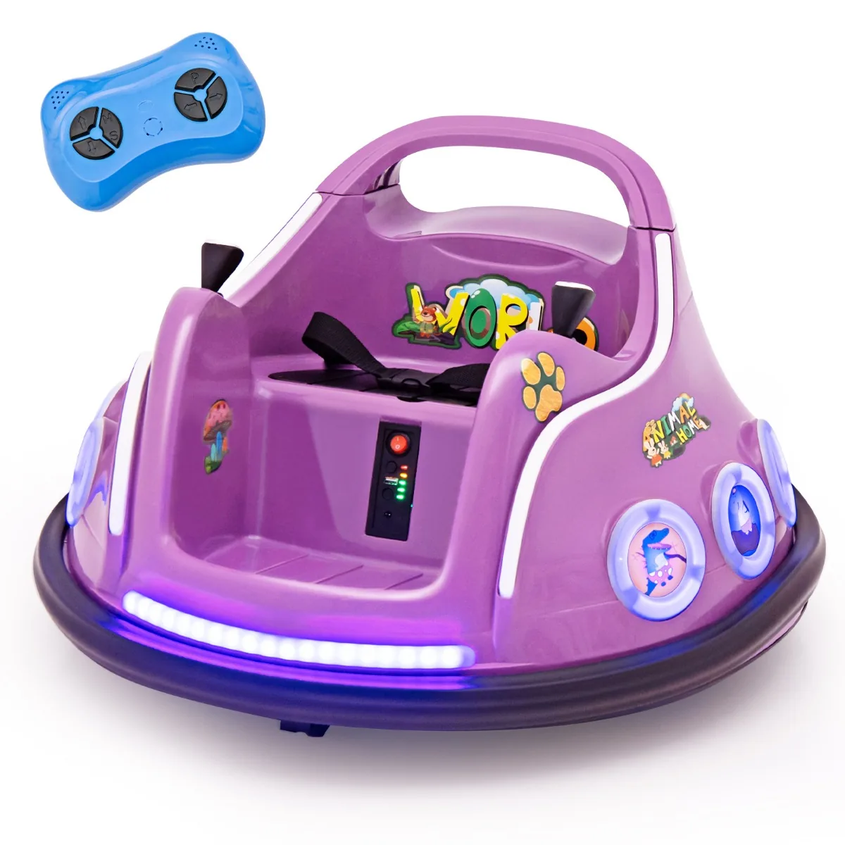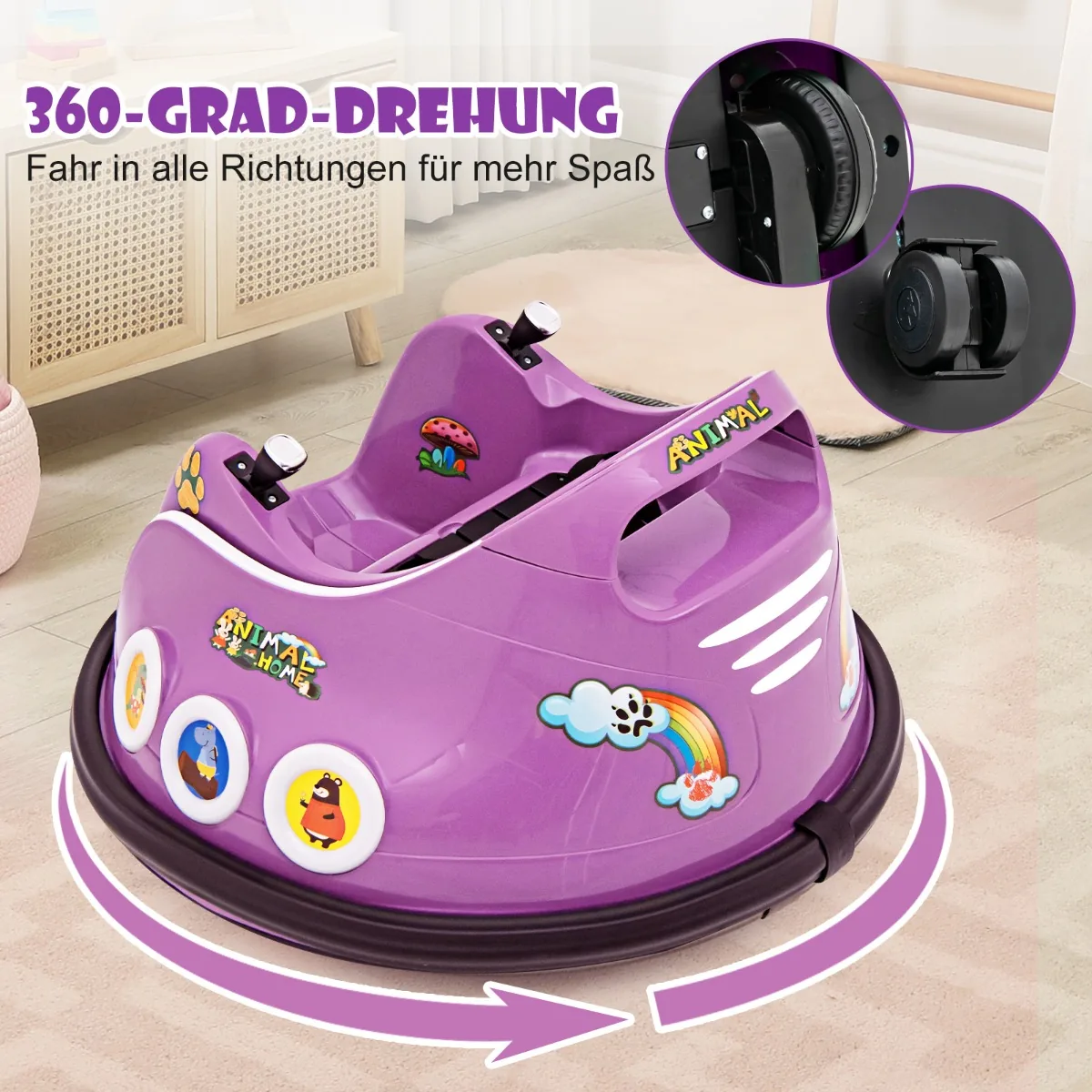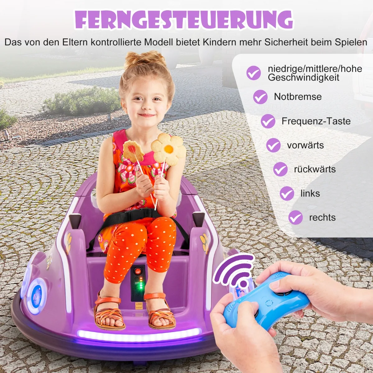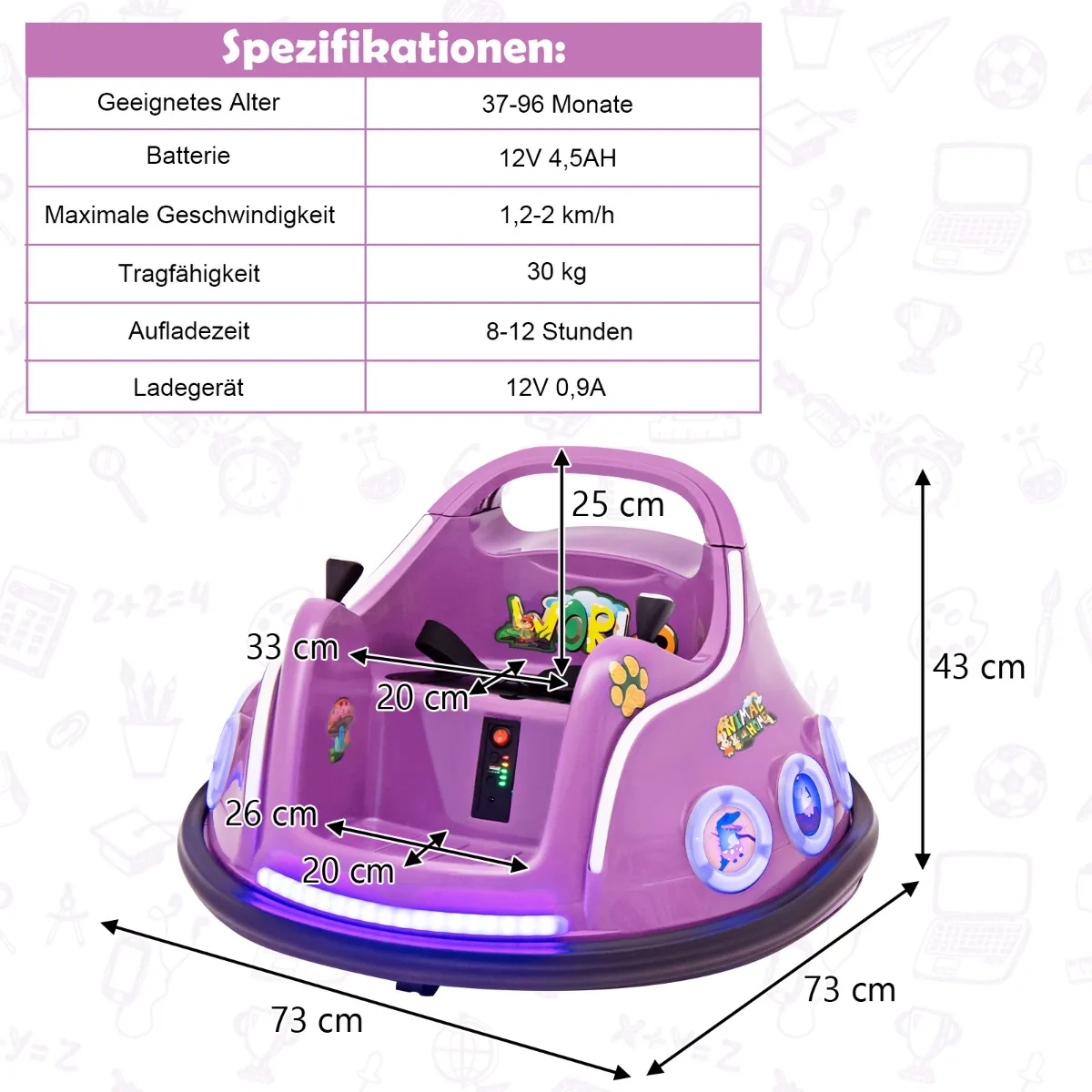 Vaikiškas elektrinis automobilis 73x73x43 cm, violetinės ir juodos spalvos, skirtas 3–8 metų vaikams. Šis automobilis su buferiu užtikrina saugumą ir suteikia daug linksmybių vaikams, leidžiant judėti 360 laipsnių kampu įvairiomis kryptimis.