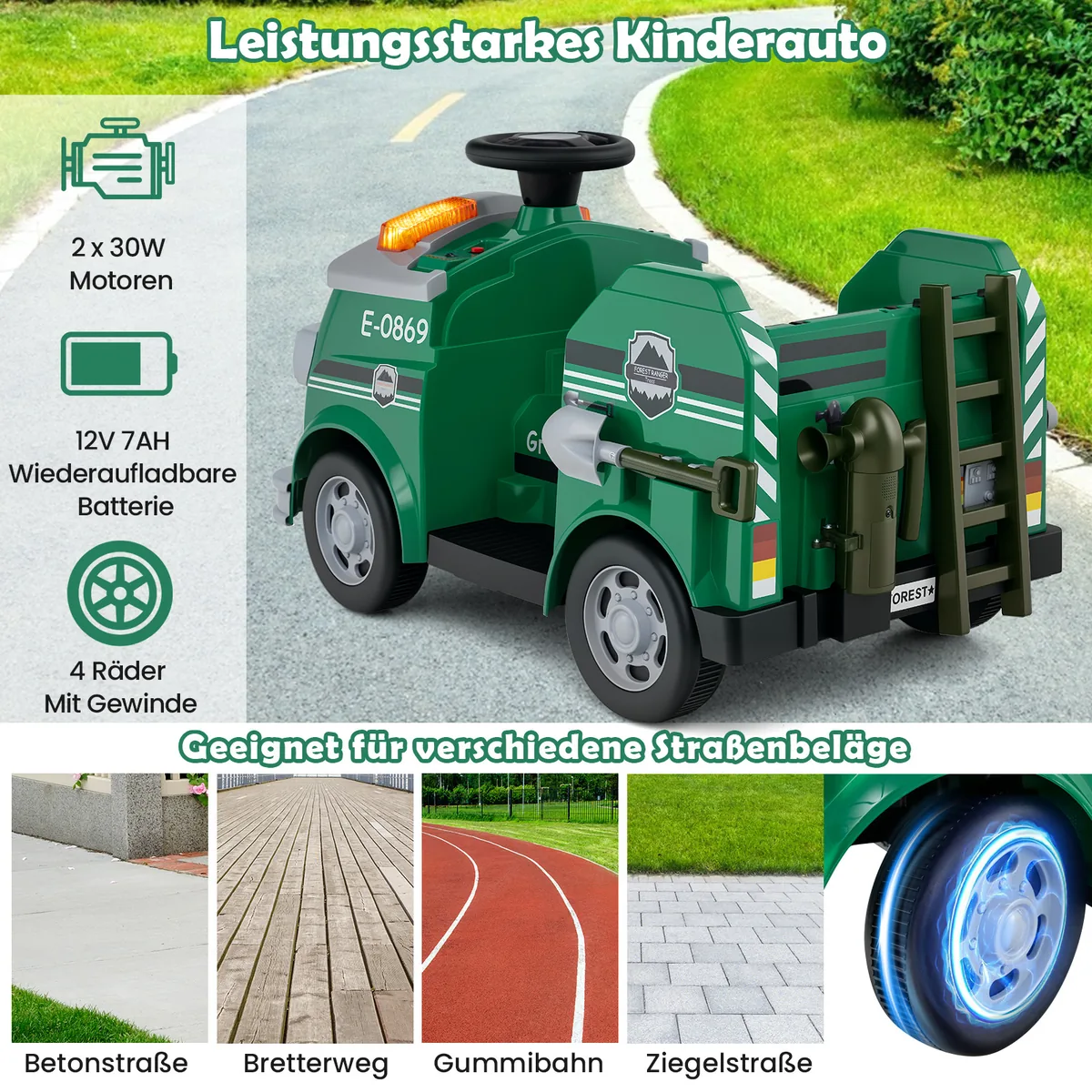 - Elektrinis vaikų automobilis su imituojamu vairu, kojiniu pedalu ir pirmyn/atgal mygtukais, leidžiantis vaikams savarankiškai valdyti transporto priemonę.