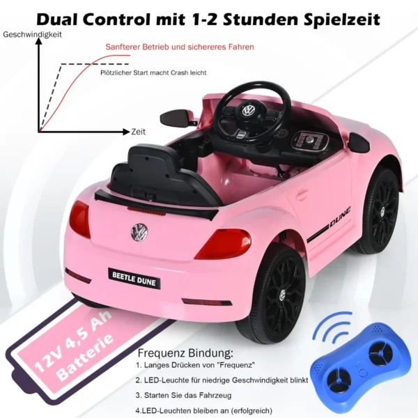Vaikiškas elektrinis automobilis 95x56x47cm, rožinės ir juodos spalvų, sukurtas atkurti tikrovišką „Volkswagen Beetle“ išvaizdą. Šis vaikams skirtas elektrinis automobilis leidžia įgyti pirmąją vairavimo patirtį su daugybe funkcijų, tokių kaip nuotolinis valdymas, muzika ir saugaus važiavimo sistemos.