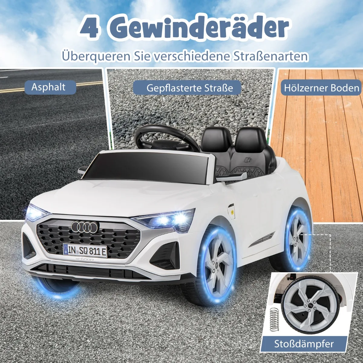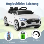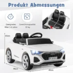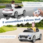 Vaikiškas elektrinis automobilis Audi SQ8 baltos ir juodos spalvos yra saugus ir patogus žaislas vaikams nuo 3 metų. Automobilis turi du vairavimo režimus – rankinį ir nuotolinio valdymo, kurie leidžia vaikams lavinti motorinius įgūdžius bei suteikia tėvams papildomos kontrolės ir ramybės. Su 12 V baterija ir 2 galingais varikliais užtikrina ilgas pramogų valandas.