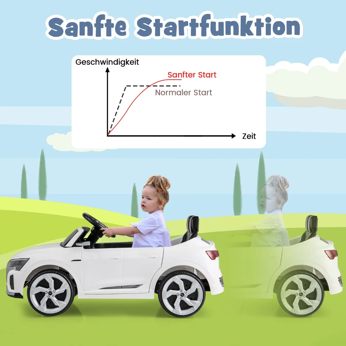 - Važiavimo greitis 3–5 km/h su minkšta paleidimo funkcija.