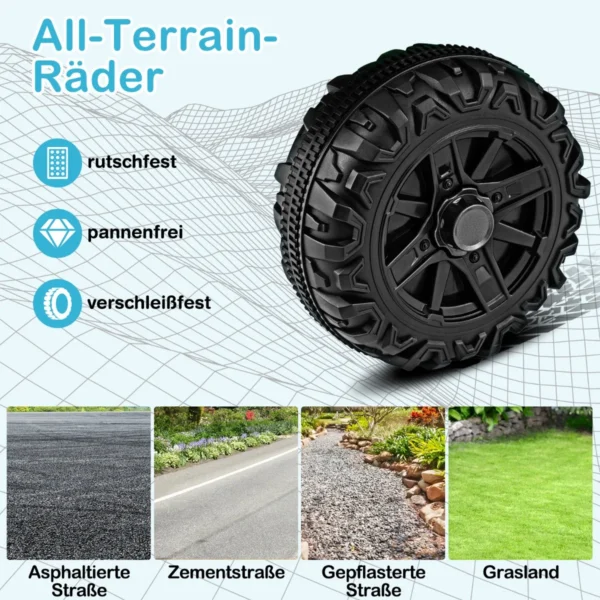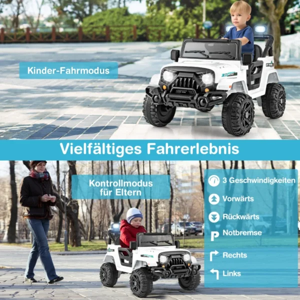 - Vaikai gali važiuoti patys naudodami vairą ir pedalus, arba tėvai gali valdyti nuotoliniu pultu su trimis greičio režimais.