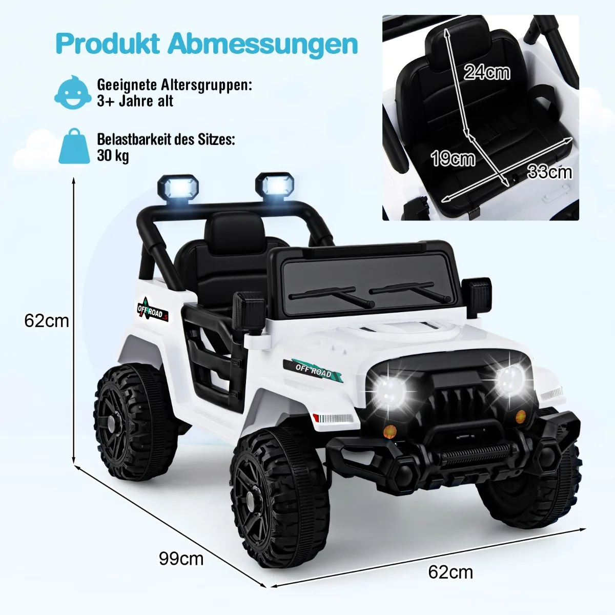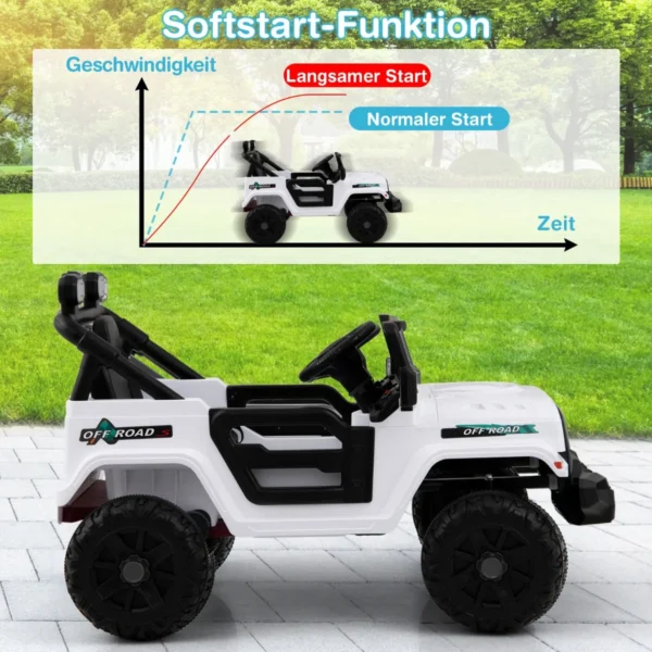 Vaikiškas elektrinis automobilis 99x62x62cm baltos ir juodos spalvos sukurtas vaikams nuo 3 metų. Šis elektrinis visureigis turi galingą 12 V bateriją, leidžiančią ilgai važinėti įvairiais paviršiais. Automobilis valdomas tiek vaikų, tiek tėvų nuotolinio valdymo pultu, todėl užtikrina saugumą ir patogumą.