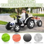 Vaikiškas elektrinis traktorius 151x68x70cm baltos ir juodos spalvos – praktiškas žaislas vaikams nuo 3 metų. Šis elektrinis traktorius su priekaba skirtas lauko žaidimams įvairiuose paviršiuose, tokiuose kaip žolė, asfaltas ar smėlis. Įrengtas muzikos grotuvu, garso signalu ir MP3 grotuvu, užtikrina smagų važiavimo laiką.