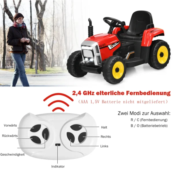 Vaikiškas elektrinis traktorius 35x51x153cm., įvairių spalvų – tai praktiškas ir saugus pasirinkimas vaikams nuo 3 metų. Šis važiuojamasis traktorius su priekaba suteikia galimybę mokytis vairavimo įgūdžių bei vežti smulkius daiktus. Įrengtas 2,4G nuotolinio valdymo pultas ir integruota muzika leidžia užtikrinti saugumą ir patogumą naudojimo metu.