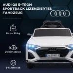Patirkite nepamirštamus nuotykius su AIYAPLAY 12V Audi Q8 etron Sportback! Šis licencijuotas vaikiškas elektromobilis suteikia jūsų mažajam vairuotojui laisvę pačiam perimti vairą arba būti patogiai valdomas nuotolinio valdymo pulteliu. Su švytinčiais priekiniais žibintais, garsiniu signalu ir muzika kiekvienas pasivažinėjimas tampa patirtimi. Keturi spyruokliniai vaikiško automobilio ratai garantuoja sklandų važiavimą įvairiais paviršiais. Saugos diržas suteikia papildomos apsaugos.