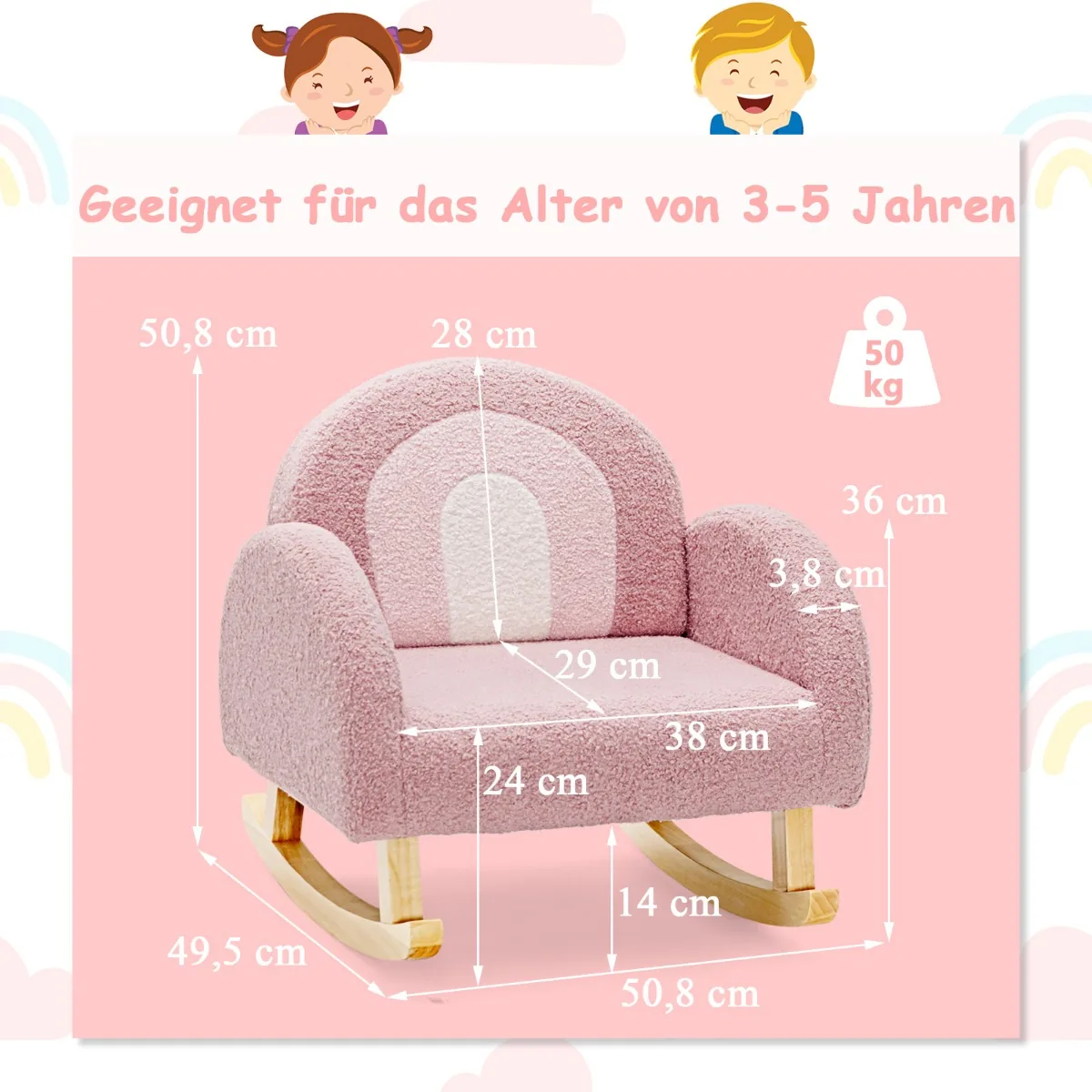 Vaikiškas fotelis 50,8×49,5×50,8 cm rožinės ir šviesiai rudos spalvų derinyje skirtas vaikams nuo 3 iki 5 metų. Jis suteikia patogią sėdėjimo vietą vaikams, kuriame galima skaityti, žaisti ar ilsėtis. Supamoji konstrukcija leidžia švelniai siūbuoti, o ergonomiškas dizainas palaiko taisyklingą laikyseną.
