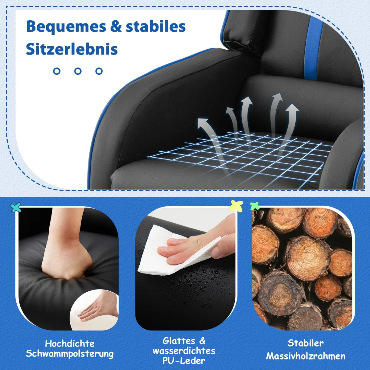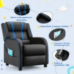 Vaikiškas fotelis 69x53x74 cm, juodos ir mėlynos spalvų, skirtas vaikams nuo 3 iki 12 metų. Ši kėdutė su reguliuojamu atlošu ir kojų atrama suteikia patogią vietą skaitymui, žaidimams ar poilsiui. Patvari konstrukcija ir lengva priežiūra leidžia naudoti šį fotelį įvairiose patalpose.