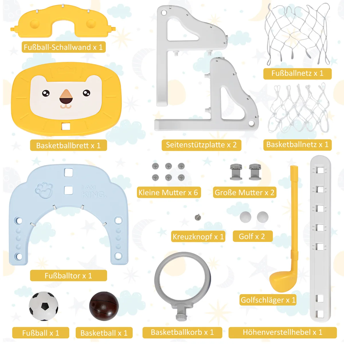 Vaikiškas krepšinio lankas su stovu 54x51x149 cm yra daugiafunkcis žaidimų rinkinys, skirtas vaikams nuo 2 iki 7 metų. Šis reguliuojamo aukščio krepšinio lankas leidžia žaisti krepšinį, futbolą bei golfą, skatindamas fizinį aktyvumą ir koordinacijos įgūdžių lavinimą.