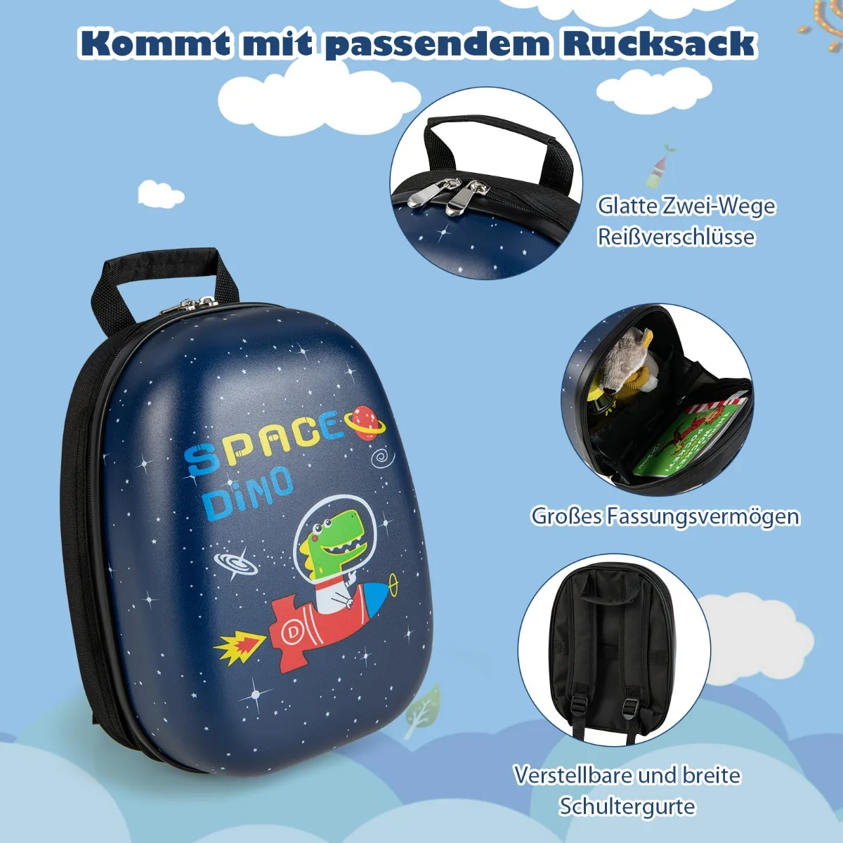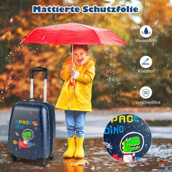 - 2 dalių vaikiško bagažo rinkinys: rankinis lagaminas ir kuprinė, pritaikyti tilpti virš galvos esančiame skyriuje arba po lėktuvo sėdyne.