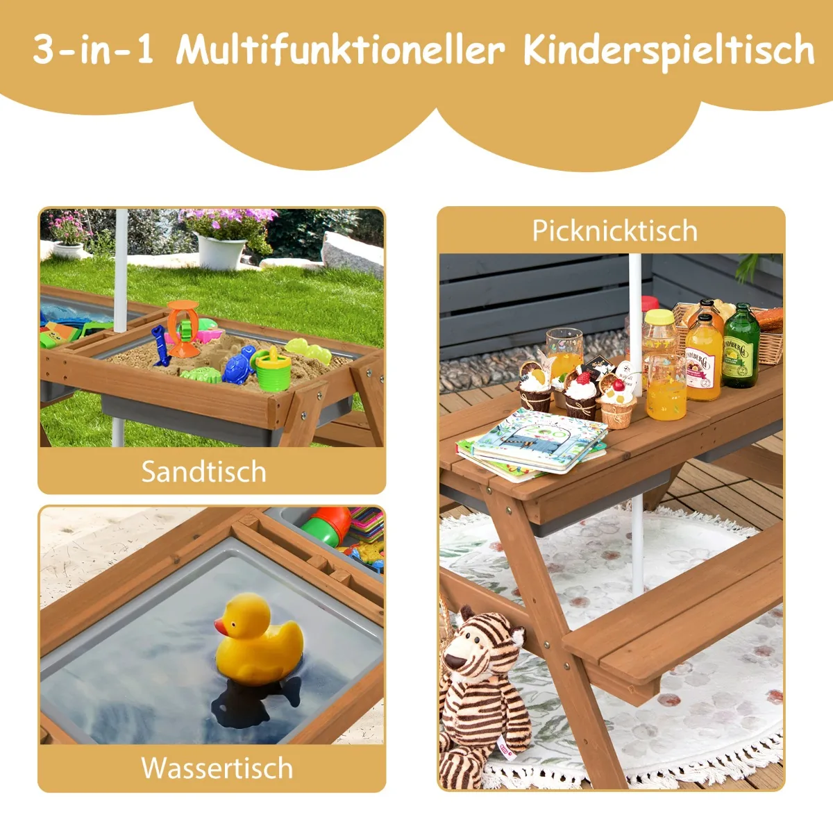 - Vaikiškas lauko stalas „trys viename“ – gali būti naudojamas kaip smėlio stalas, vandens stalas arba pikniko stalas valgymui.
