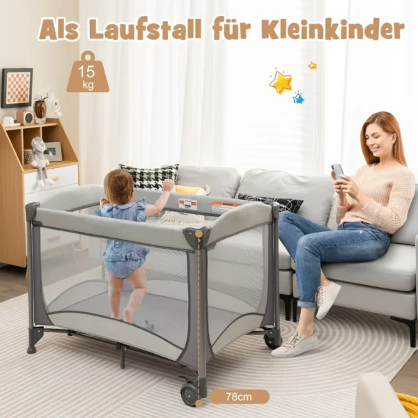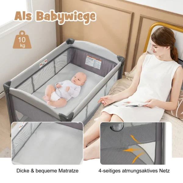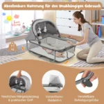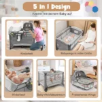 • Nešiojamas 5 viename kūdikių maniežas su lovele, lopšiu, persirengimo stalu, žaidimų zona ir laisvai stovinčiu maniežu.
