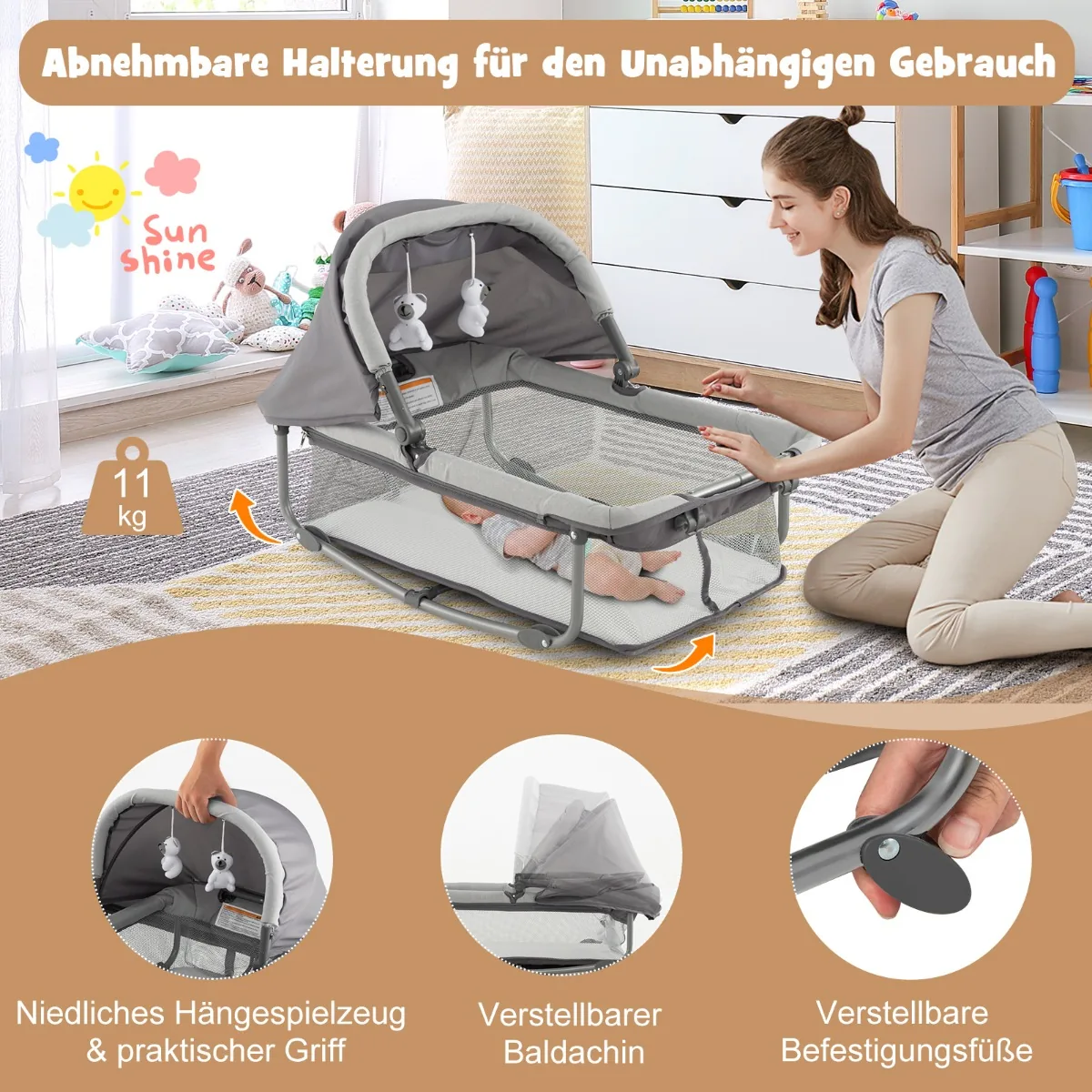 • Nuimamas lopšys su reguliuojamu baldakimu ir 2 kabančiais žaislais užtikrina ramią miego vietą ir lavina pažintinius įgūdžius.