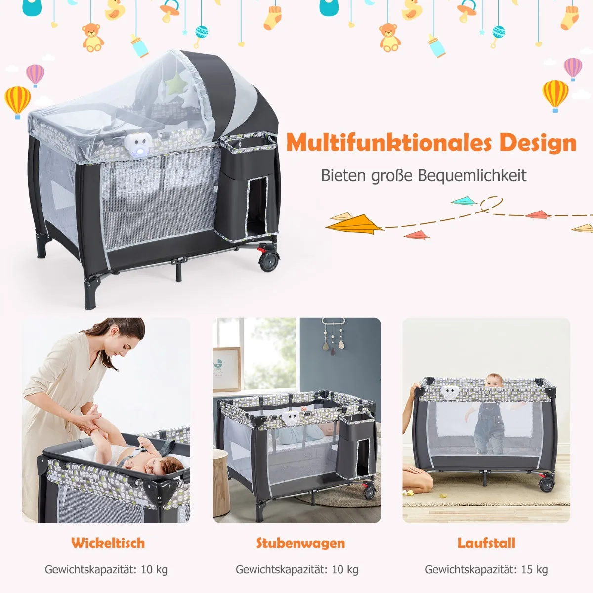 - Nešiojama žaidimų lova su nuimamu ir reguliuojamu tinkleliu, apsaugančiu nuo uodų ir tiesioginių saulės spindulių.